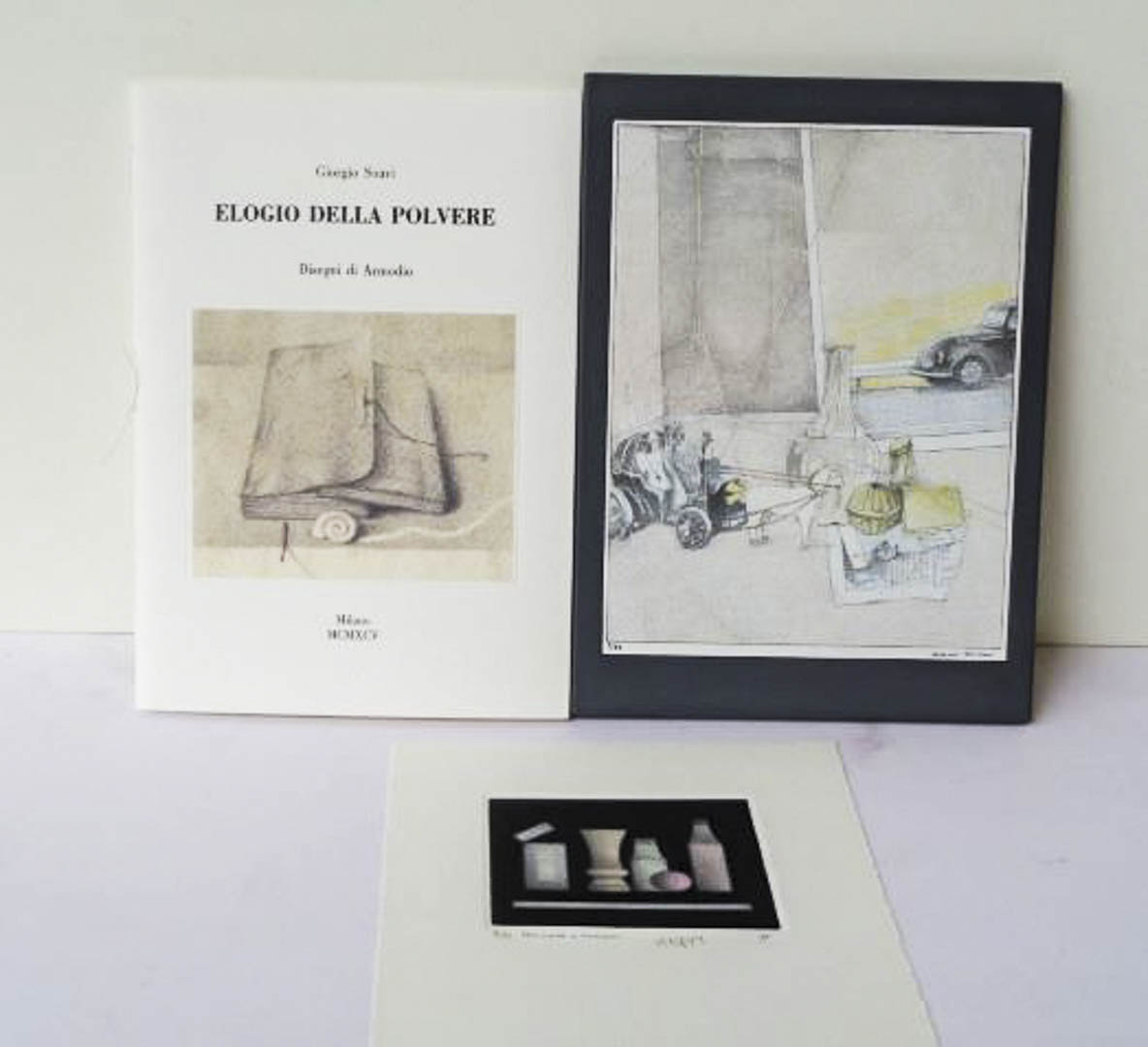 Armodio Elogia della polvere, 1996 Testo di Giorgio Soavi. 21,5 x 15,5 cm., Illustrazioni di Armodio. Edizione fuori commercio a cura di Gianni Biolcati di trecento esemplari numerati. Stampata a Milano per il capodonno 1996. Le copie da 1 a 99 contengono una maniera nera di Mario Avati ed una litografia a colori su tavoletta colorata a mano di Rosario Morra. Nostro esemplare nr. 5