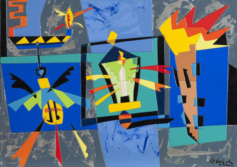 Ugo Nespolo Luci e bagliori Acrilici su legno intarziato, cm. 50x70 Firmato in basso a destra. Sul verso: titolo e descrizione; Timbro dell'Artista.