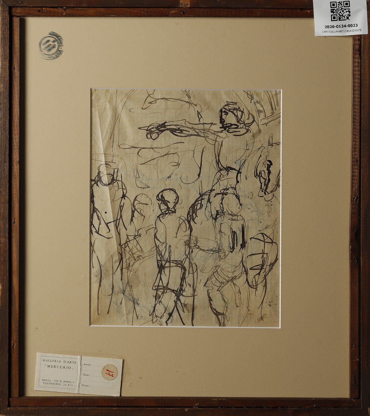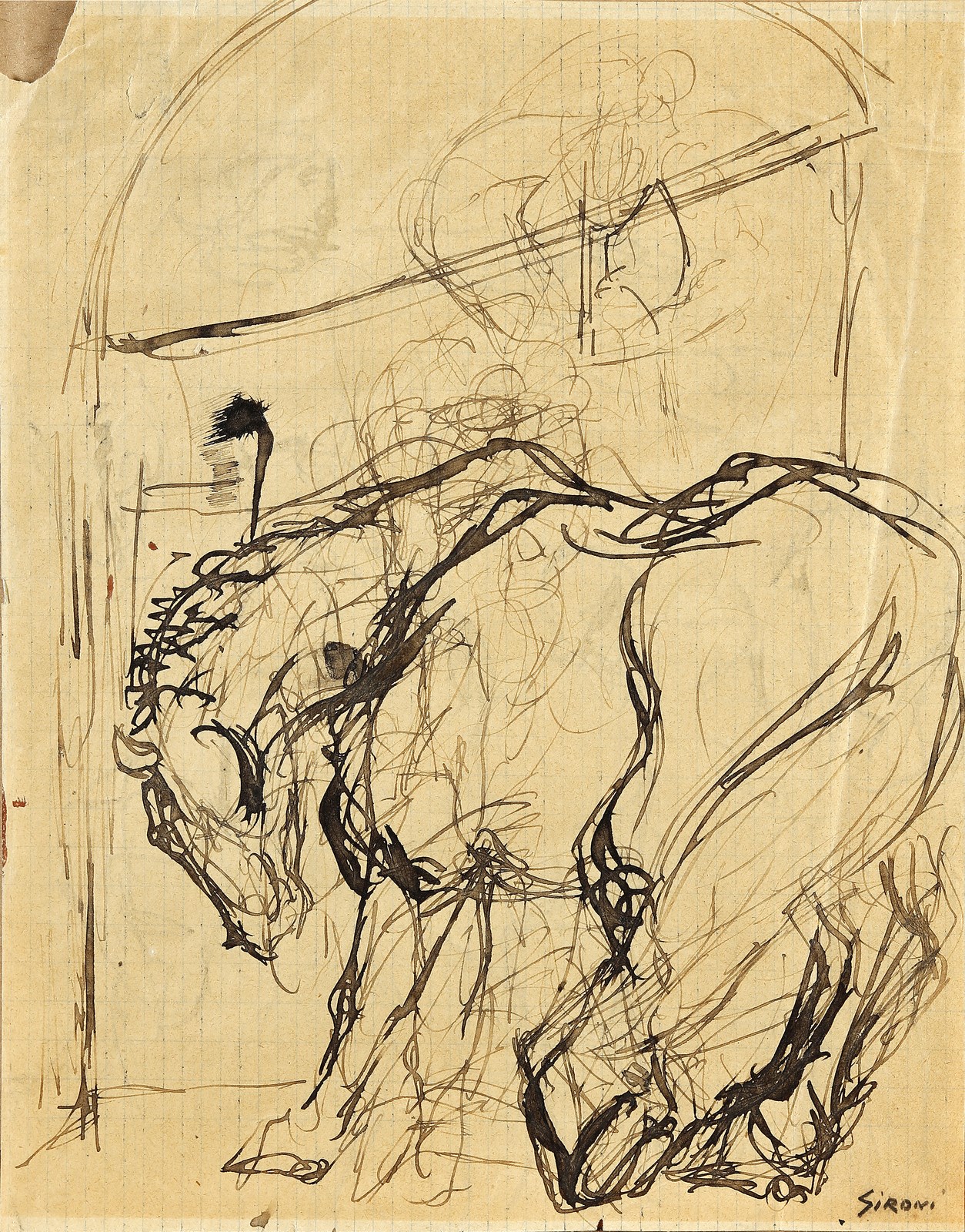 SIRONI MARIO (1885 - 1961). Composizione con cavallo. Al verso Figure e figura equestre.. Firma apocrifa in basso a destra (Probabilmente di Matilde Fabbrini Sironi). Pubblicazione: Mario Sironi, Galleria Mercurio, 18 Gennaio - 5 Febbraio 1967, n.17. Opera archiviata presso l'Associazione per il patrocinio e la promozione della figura e dell'opera di Mario Sironi, Milano... Inchiostro su carta. Cm 20,10 x 25,60. 1920