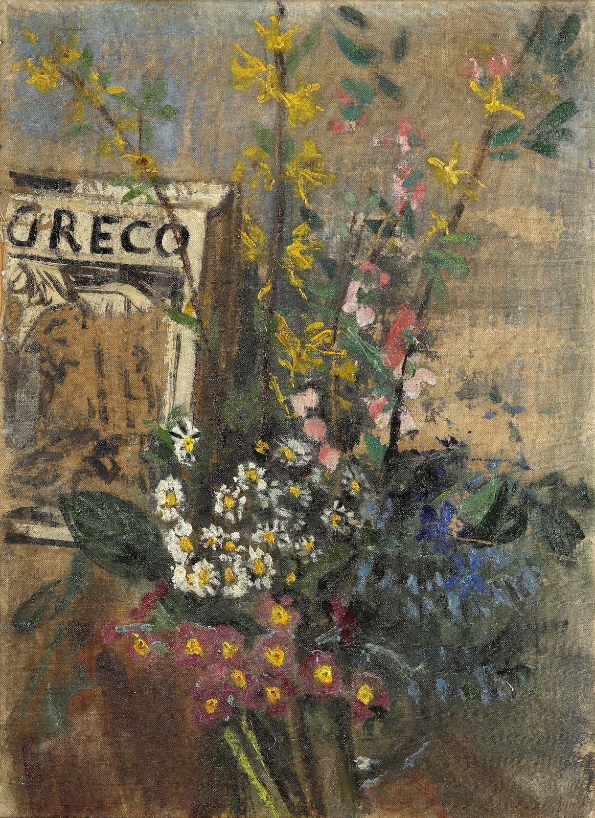 DE PISIS FILIPPO (1896 - 1956). Fiori con libro del Greco.. Opera archiviata presso l'Associazione Filippo De Pisis, Milano come da documentazione allegata all'opera riportante il relativo numero d'inventario.. Olio su tela. Cm 34,90 x 48,30. 1926