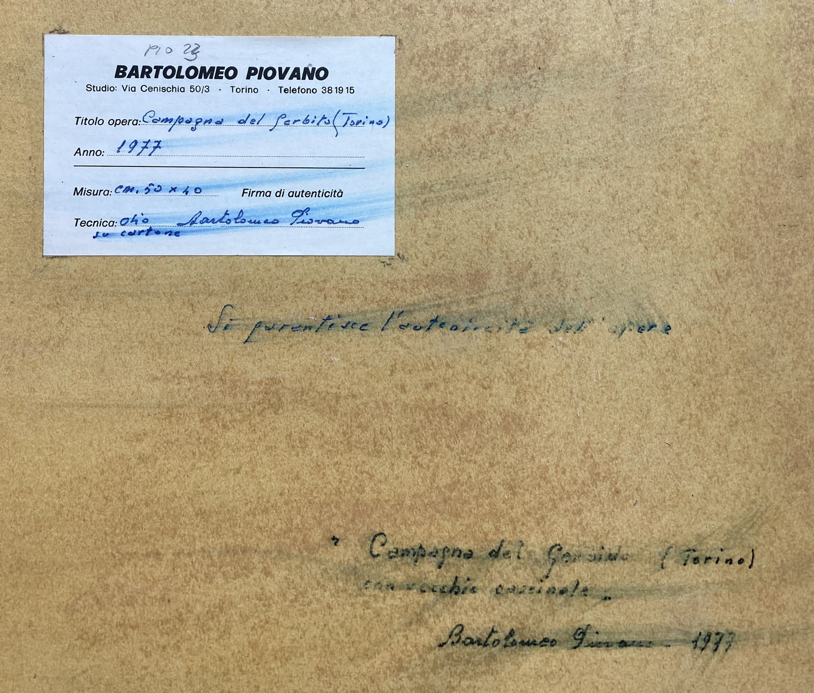 PIOVANO BARTOLOMEO (1903 - 1988). Paesaggio del Gerbido.. Firmato in basso a destra. Titolo firma e anno al retro.. Olio su tavola. Cm 50,00 x 40,00. 1977