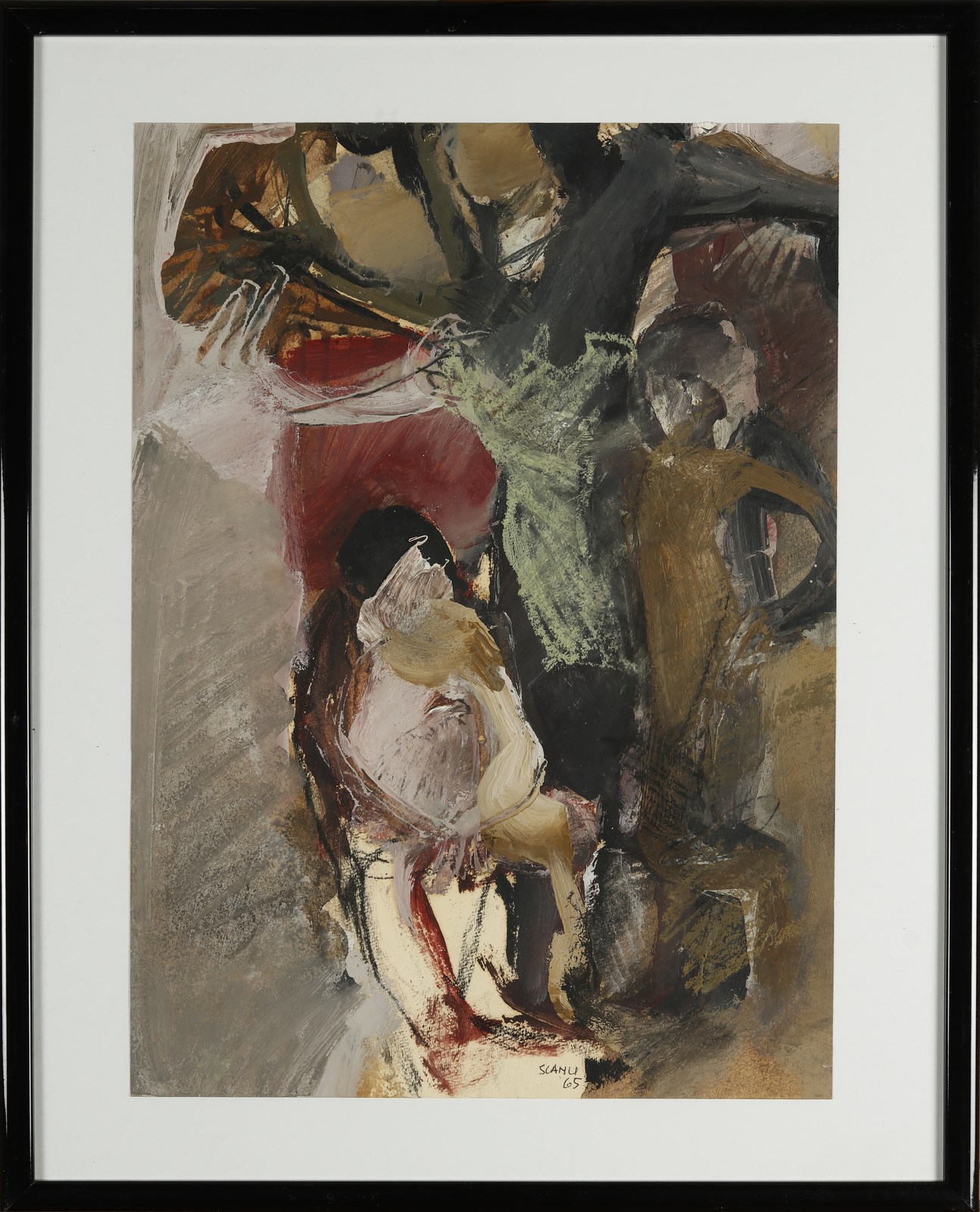 SCANU SERGIO (n. 1931). Senza titolo. Firma e anno in basso al centro.. Tecnica mista su cartoncino. Cm 30,00 x 42,00. 1965