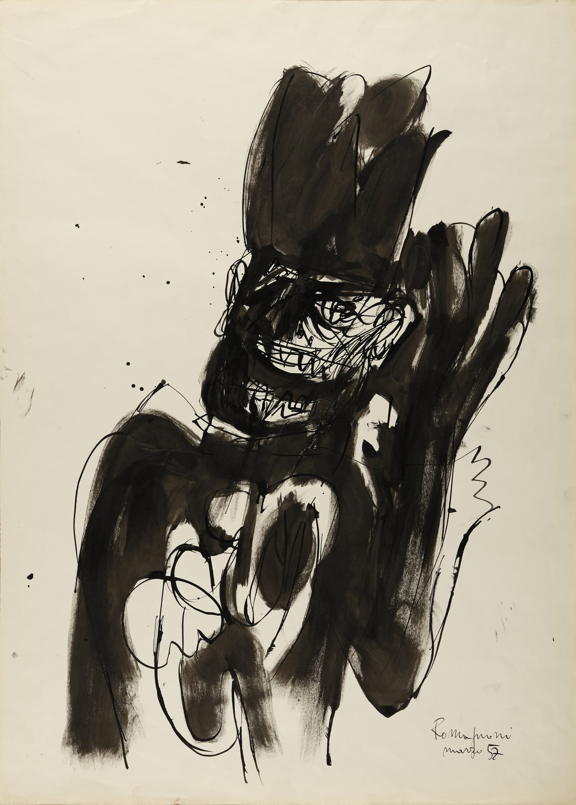 ROMAGNONI BEPI (1930 - 1964). Senza titolo.. Firma e anno in basso a destra.. China su carta. Cm 50,00 x 70,00. 1957