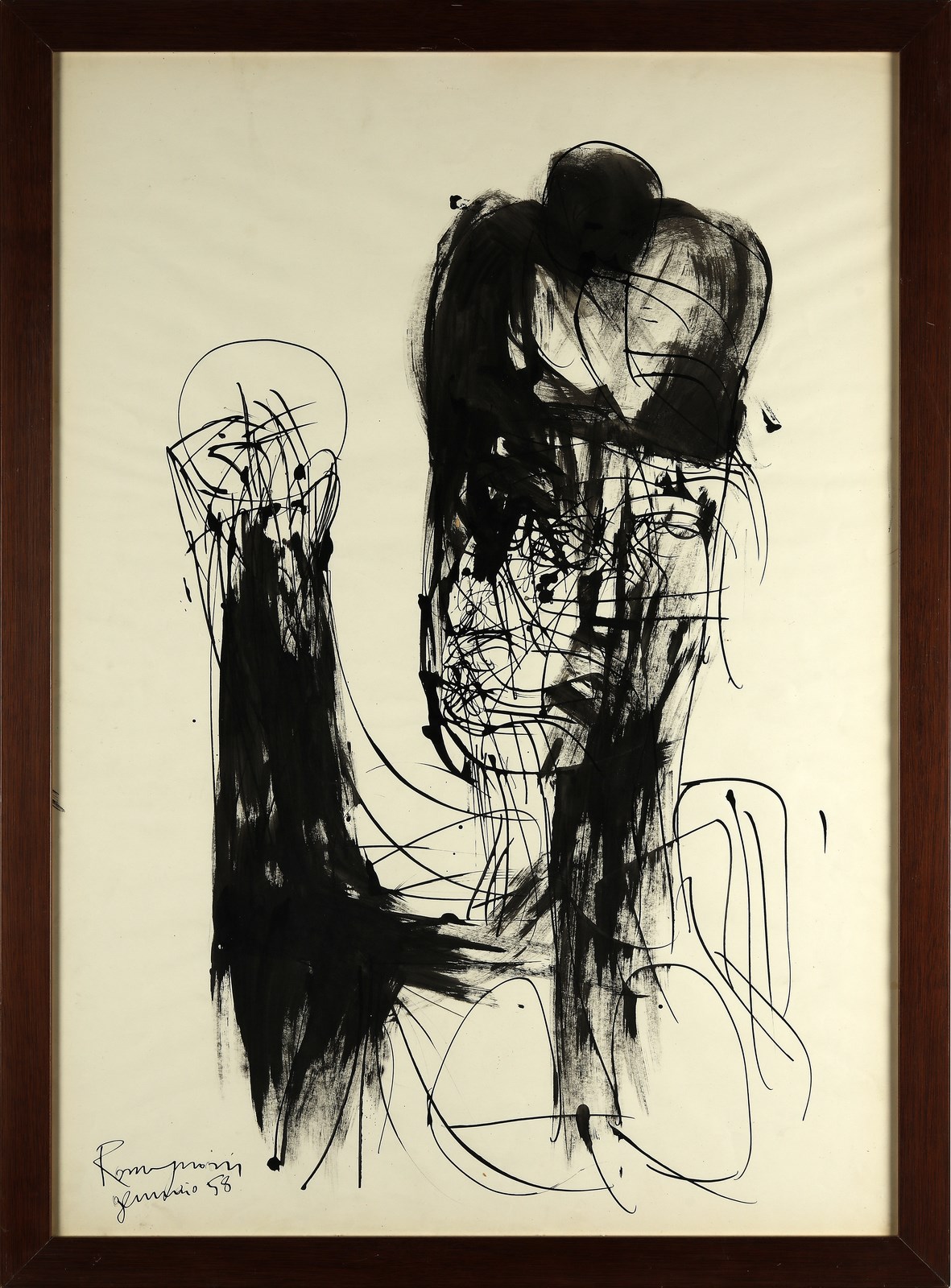 ROMAGNONI BEPI (1930 - 1964). Senza titolo.. Firmato e datato in basso a sinistra.. Tecnica mista su carta. Cm 50,00 x 70,00. 1958
