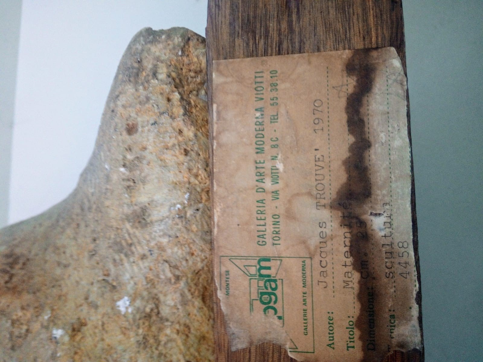 TROUVE' JACQUES (n. 1944). Maternitè.. Alla base reca il cartiglio della galleria d'arte Viotti, Torino.. Pietra. Cm 36,00 x 26,00 x 26,00. 1970