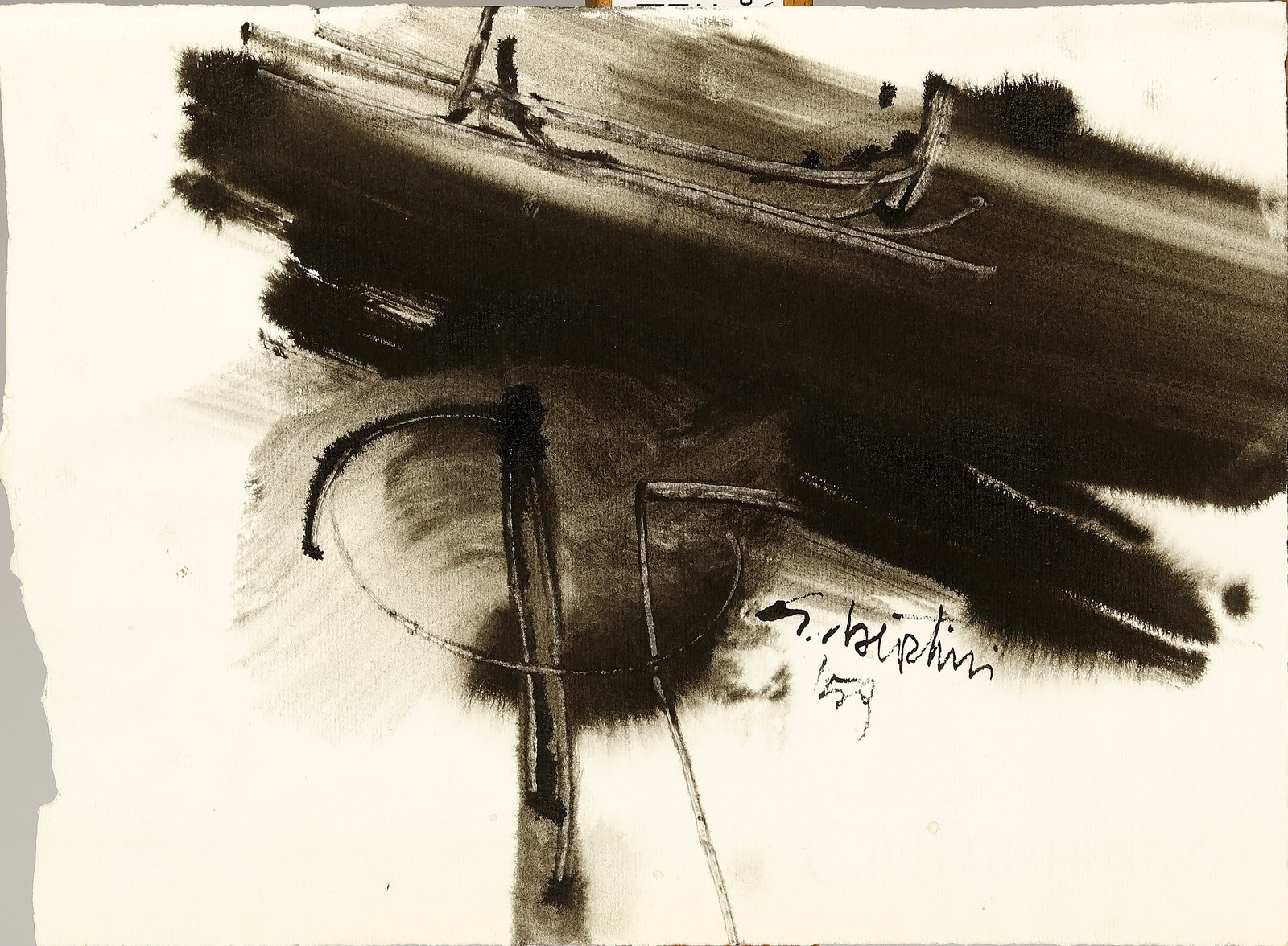 BERTINI GIANNI (1922 - 2010). Senza titolo.. Firma e anno in basso a destra. Autentica su fotografia della Galleria Dell'Agrifoglio, Milano.. China su carta. Cm 28,50 x 21,00. 1959