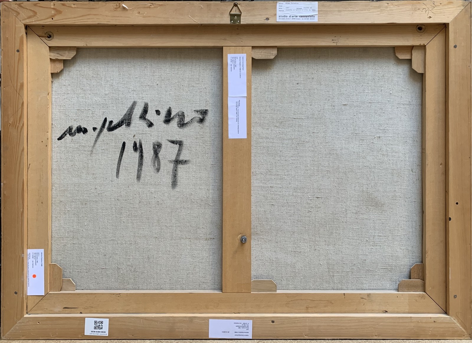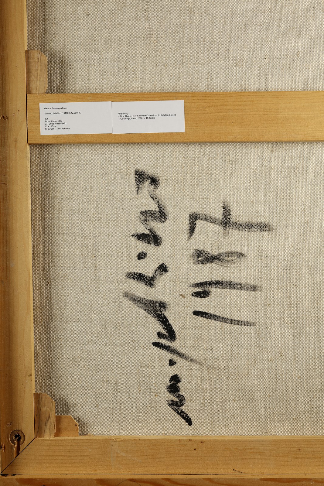 PALADINO MIMMO (n. 1948). Senza titolo.. Firma e anno al retro. Provenienza: Galerie Carzaniga Basel (etichetta al retro); Studio d'Arte Cannaviello (etichetta al retro), Milano. Si ringrazia l'archivio Mimmo Paladino per aver confermato l'autenticità dell'opera.. Tecnica mista su tela. Cm 70,00 x 100,00. 1987