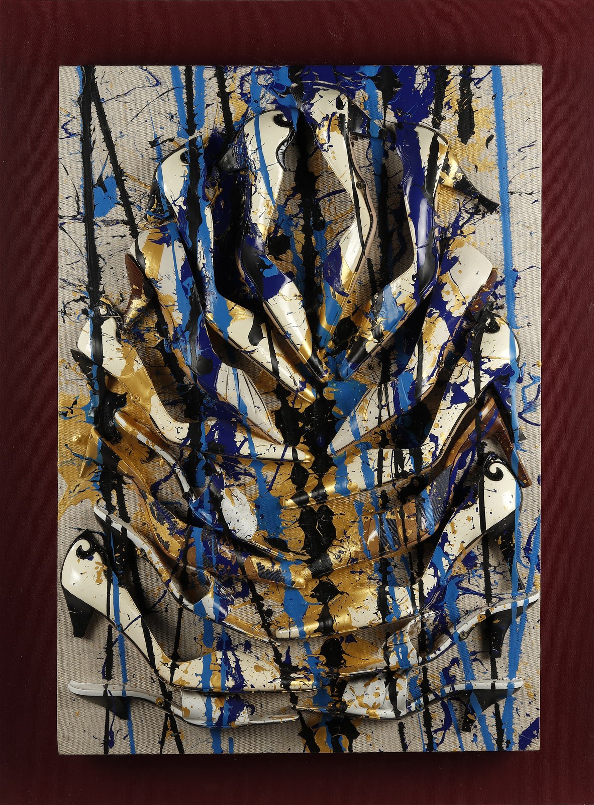 ARMAN FERNANDEZ (1928 - 2005). Chaussures decoupéès.. Firma sotto la base. Entro teca di plexiglass. Autentica dell'artista su fotografia con numero di archiviazione. Certificato di autenticità e provenienza della Galleria Dante Vecchiato, Padova.. Tecnica mista e applicazioni su tela. Cm 50,00x73,00. 2002