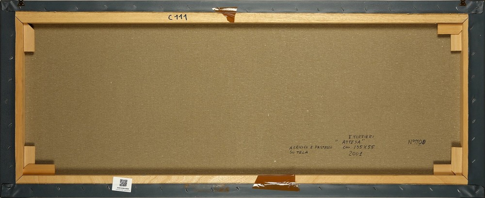 TORRIERI ELIO (n. 1945). Attesa.. Opera archiviata presso la Galleria D'Arte Dante Vecchiato, Padova, come da documentazione fotografica allegata all'opera riportante il relativo numero d'inventario. Pubblicazioni: Torriei, Ascolto, catalogo della mostra personale tenuta presso la New Art Gallery, Padova, tra il 7 febbraio e il 7 marzo 2002, p.14.. Olio su tela. Cm 55,00 x 135,00. 2001