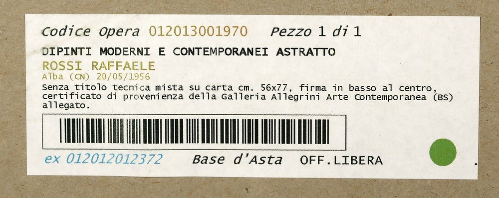ROSSI RAFFAELE (n. 1956). Senza titolo.. Firma in basso al centro. Provenienza: Allegrini Arte Contemporanea, Brescia.. Tecnica mista su carta. Cm 77,00 x 56,00.