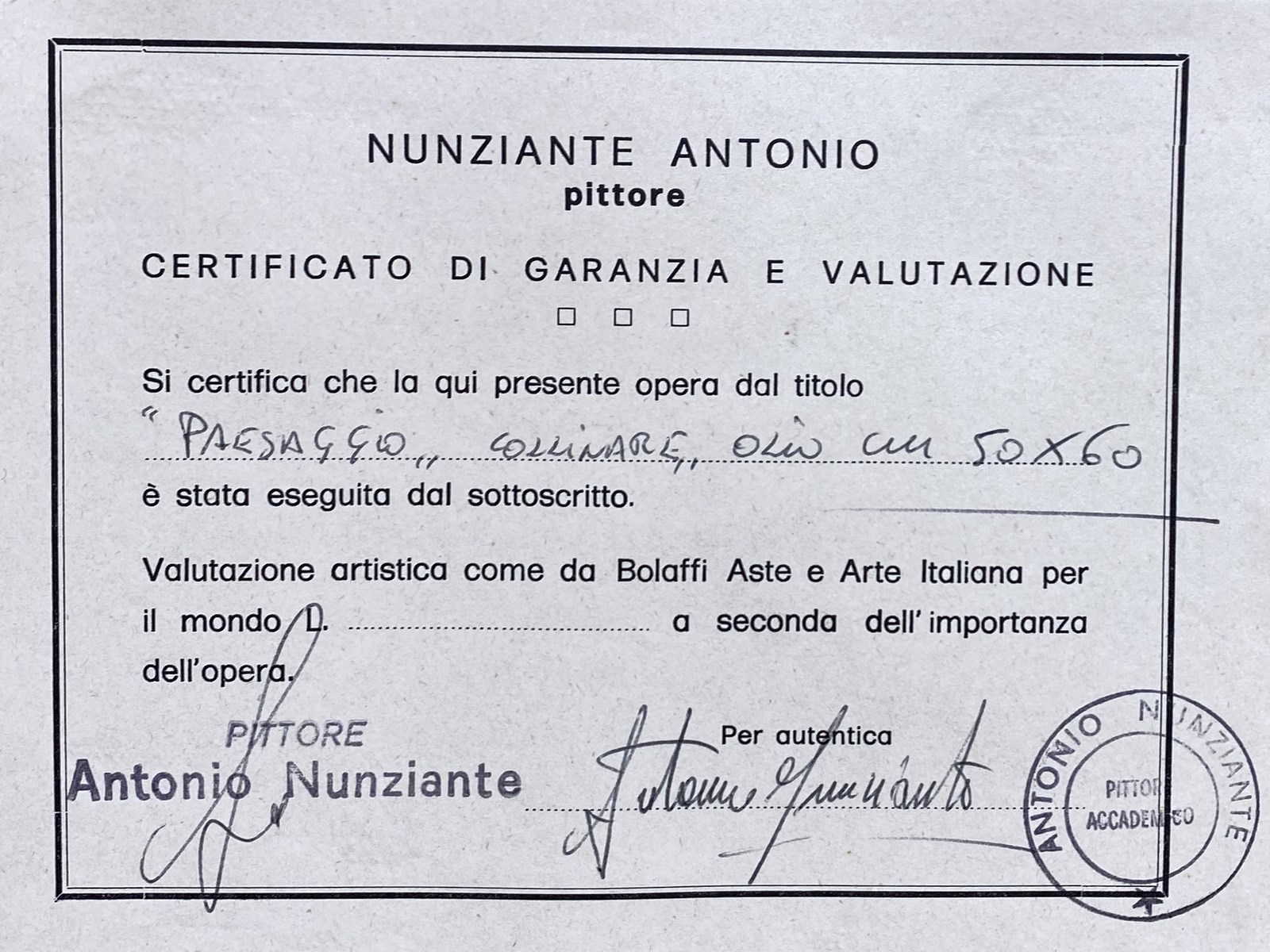 NUNZIANTE ANTONIO (n. 1956). Paesaggio collinare.. Firma, titolo e cartiglio descrittivo dell'artista al retro.. Olio su tela. Cm 60,00 x 50,00.