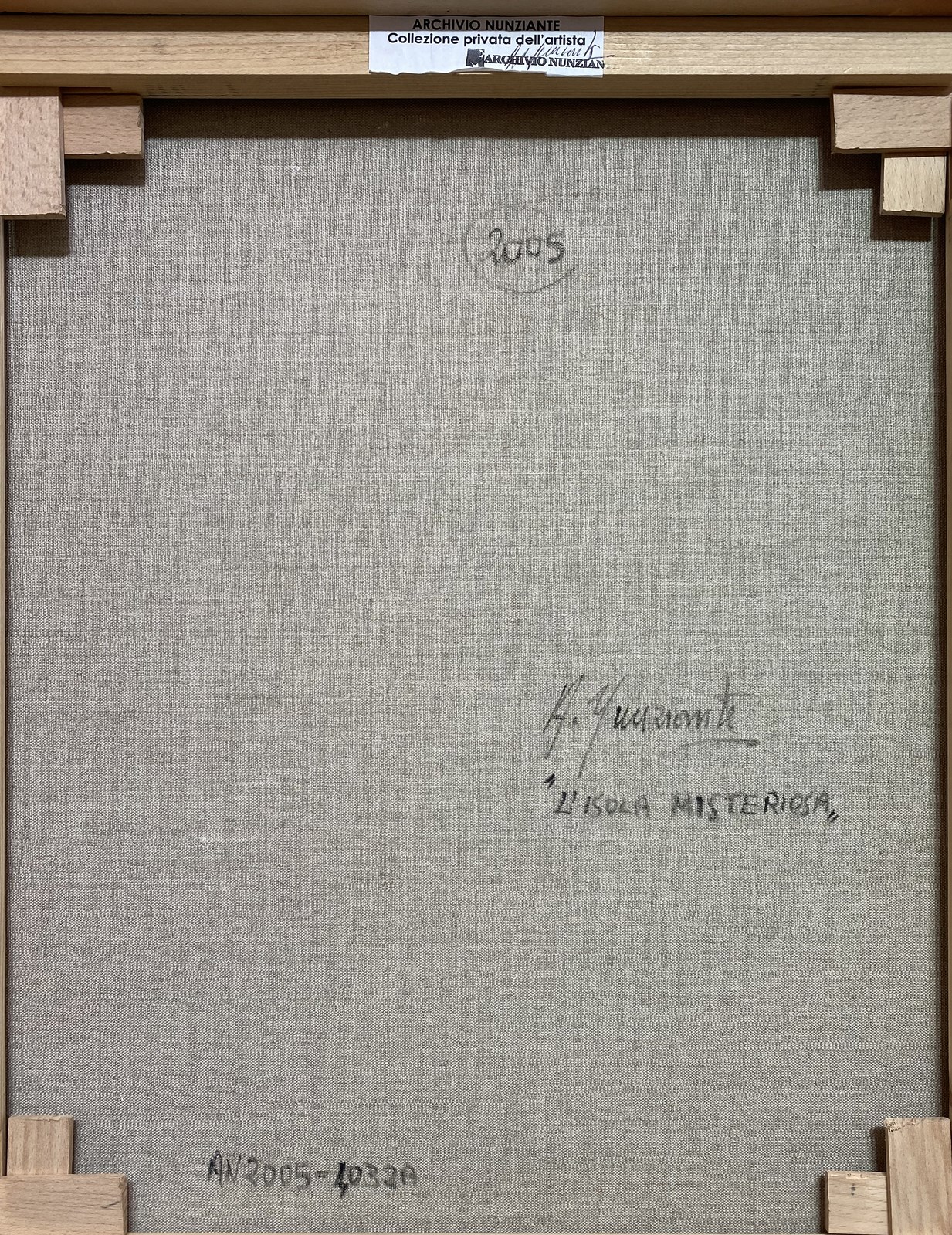NUNZIANTE ANTONIO (n. 1956). L'isola misteriosa.. Firmato in basso a destra. Firma, titolo e anno al retro. Opera archiviata presso l'Archivio Antonio Nunziante come da documentazione fotografica allegata all'opera come da documentazione fotografica allegata all'opera.. Olio su tela. Cm 60,00 x 50,00. 2005