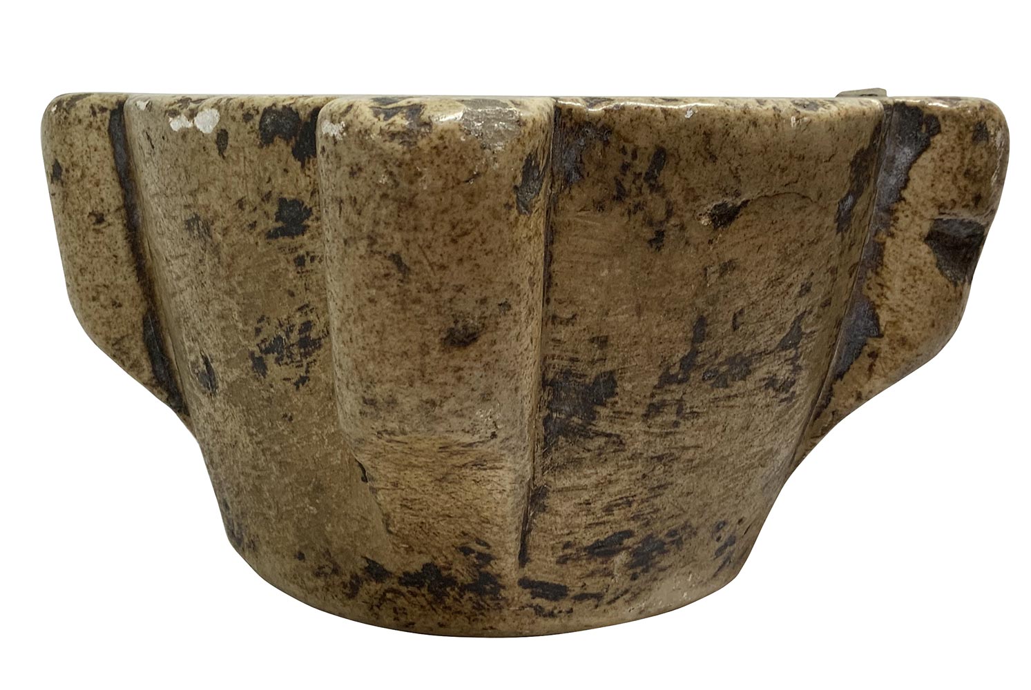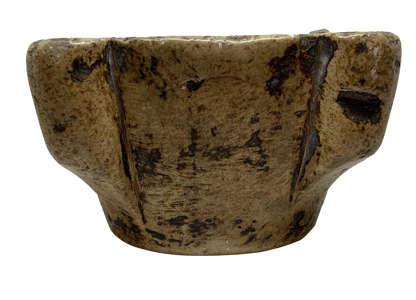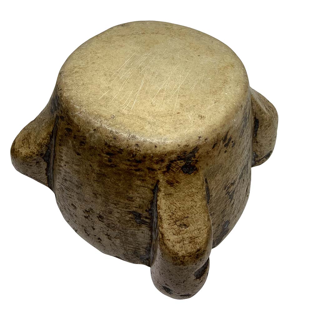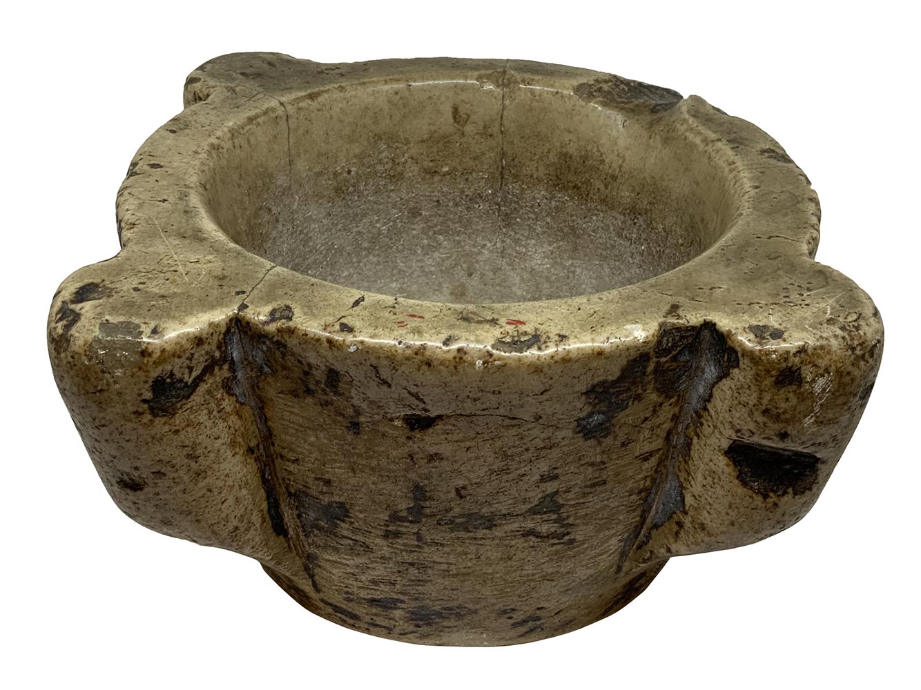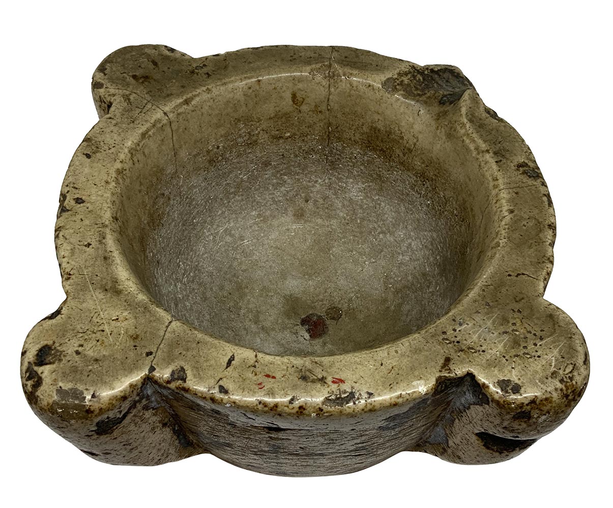 Mortaio in marmo, XVII secolo. Mancanze. H cm 13 , bocca cm 24.