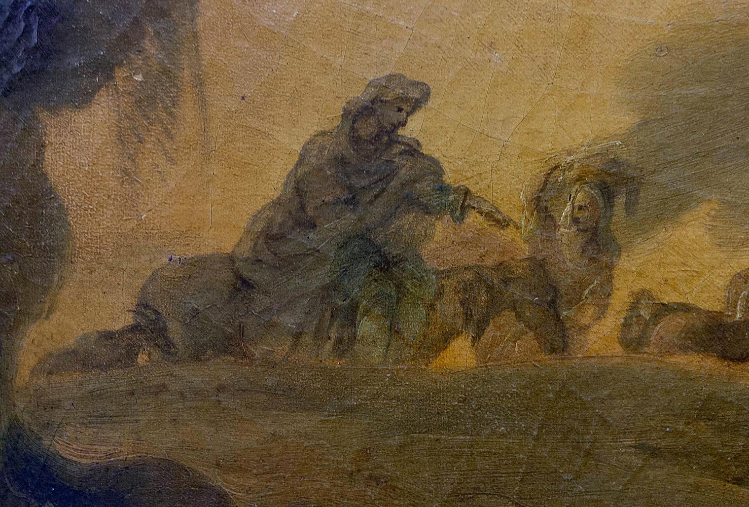 Pittore italiano del XVII secolo, ambito Romano. Paesaggio con pastori. 75x130, olio su tela. Buco alla tela e cadute di colore. Antica collezione Notaio Cav. Fazio. Superficie del dipinto risulta interessata dalla presenza di uno strato di vernice ossidata e ingiallita.