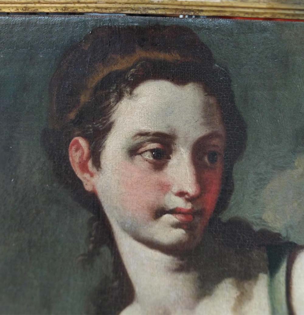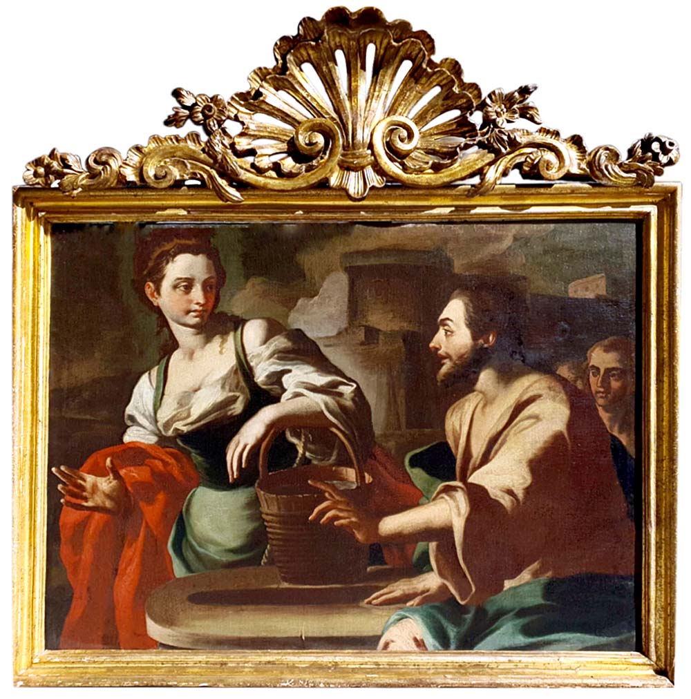 Francesco Solimena (Canale di Serino 1657-Barra di Napoli 1747). Cristo e la samaritana al pozzo, scena biblica. 76x102, olio su tela. Bella cornice coeva. "Questa bella tela si presenta in buono stato conservazione e raffigura Cristo che incontra la Samaritana al pozzo e credo di poter asserire si tratti di un’opera di Francesco Solimena (Canale di Serino 1657 - Barra di Napoli 1747).