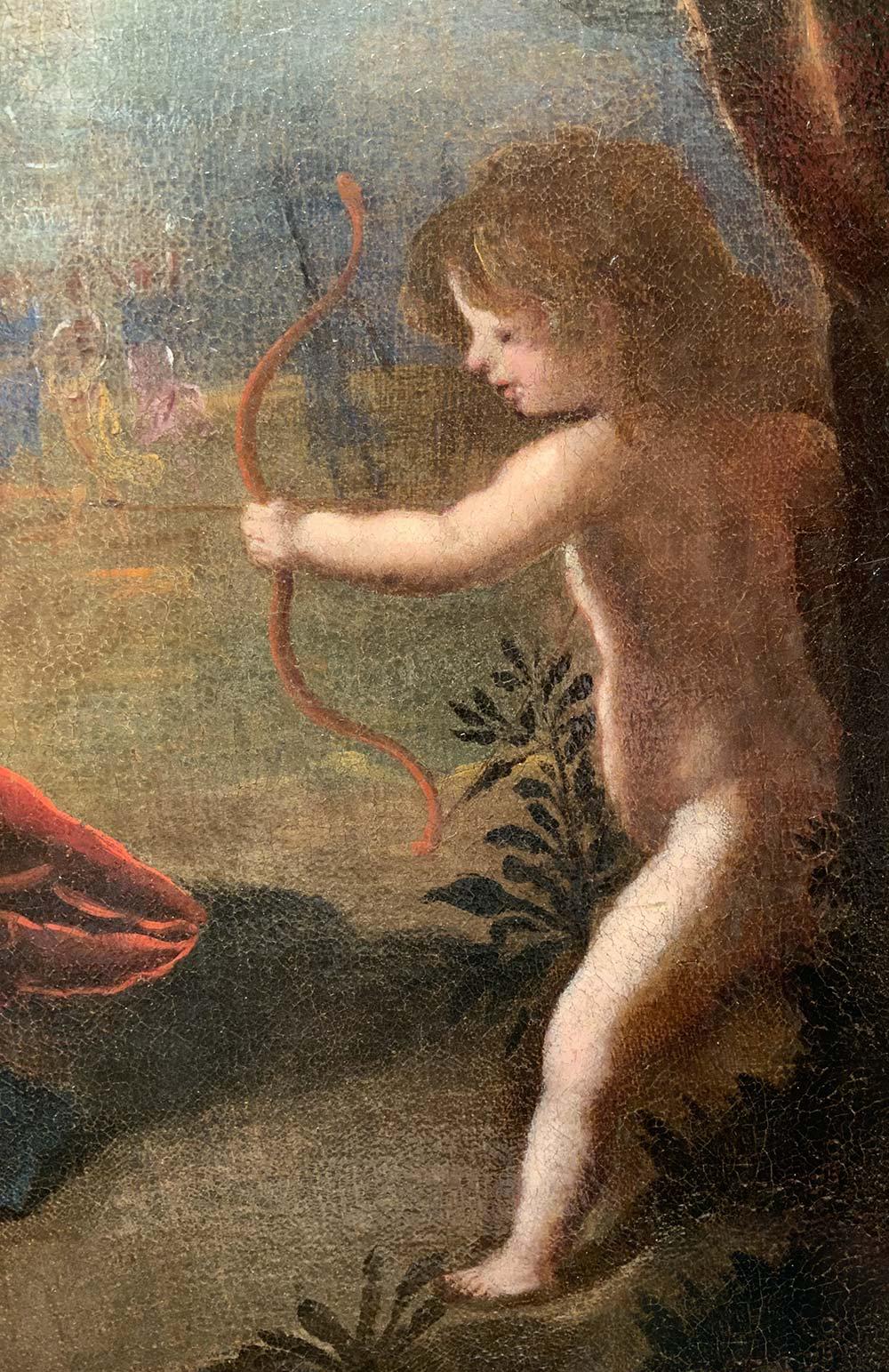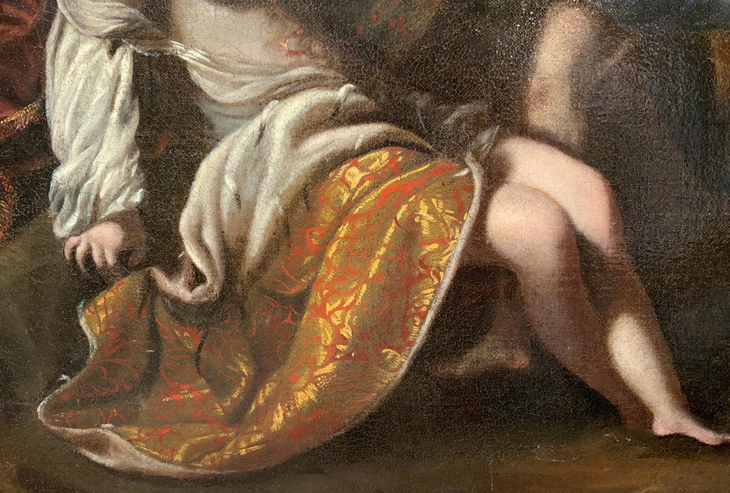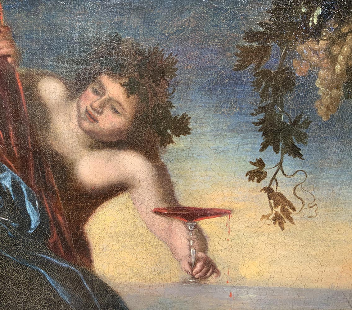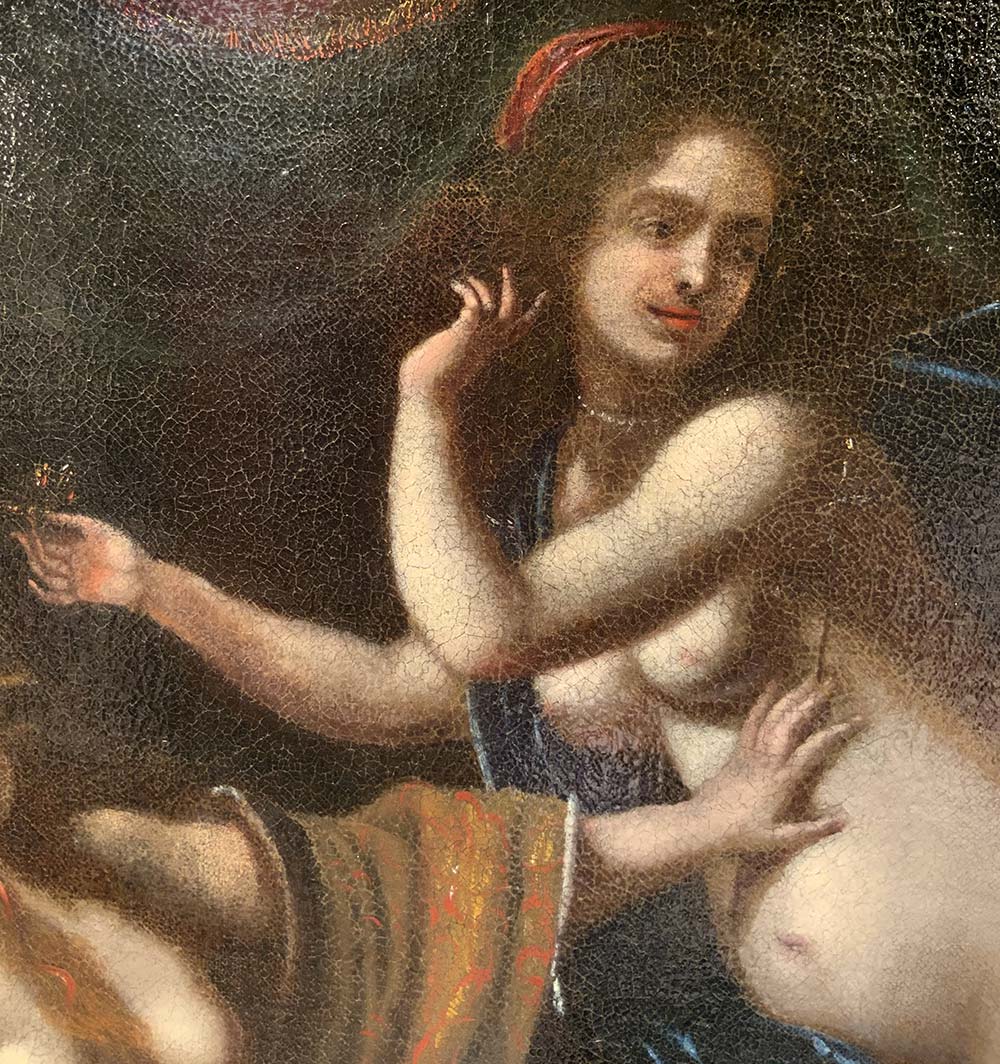 Felice Ficherelli, detto "Il Riposo" (S.Gimignano 1605-Firenze 1660), Attrib. Scena mitologica, Arianna addolorata per l'abbandono di Perseo, Dioniso la consola e le offre la corona con i diamanti che costituiranno la Corona Boreale o Costellazione di Arianna. L'opera è persuasa da una sottilissima sensualità, di ascendenza furiniana sono la morbidezza dell'incarnato di Arianna e dell'ancella. Arianna addolorata per l'abbandono di Teseo sebbene malinconica mentre si strugge per il dolore. L'avvicinarsi dell'opportunità di Dioniso fa scaturire una somma di intenzioni e sentimenti che i protagonisti recitino ed emergono come in una piazza teatrale. Sulla scena con le loro forme dal carnato luminoso con l'espressionismo dei volti che esprimono emotività interiore, con l'ampiezza dai movimenti enfatici danno vita ad un'opera che si racconta da sola, impreziosita da artifici pittorici creati dal pittore, come le zone d'ombra che accendono di luce le forme. In tutto questo il pittore mostra affinità con i suoi contemporanei: Furini Francesco (1603-1641) e Cecco il Bravo (1601-1661), suoi coetanei. 70x105 Olio su tela, in cornice 90x125.