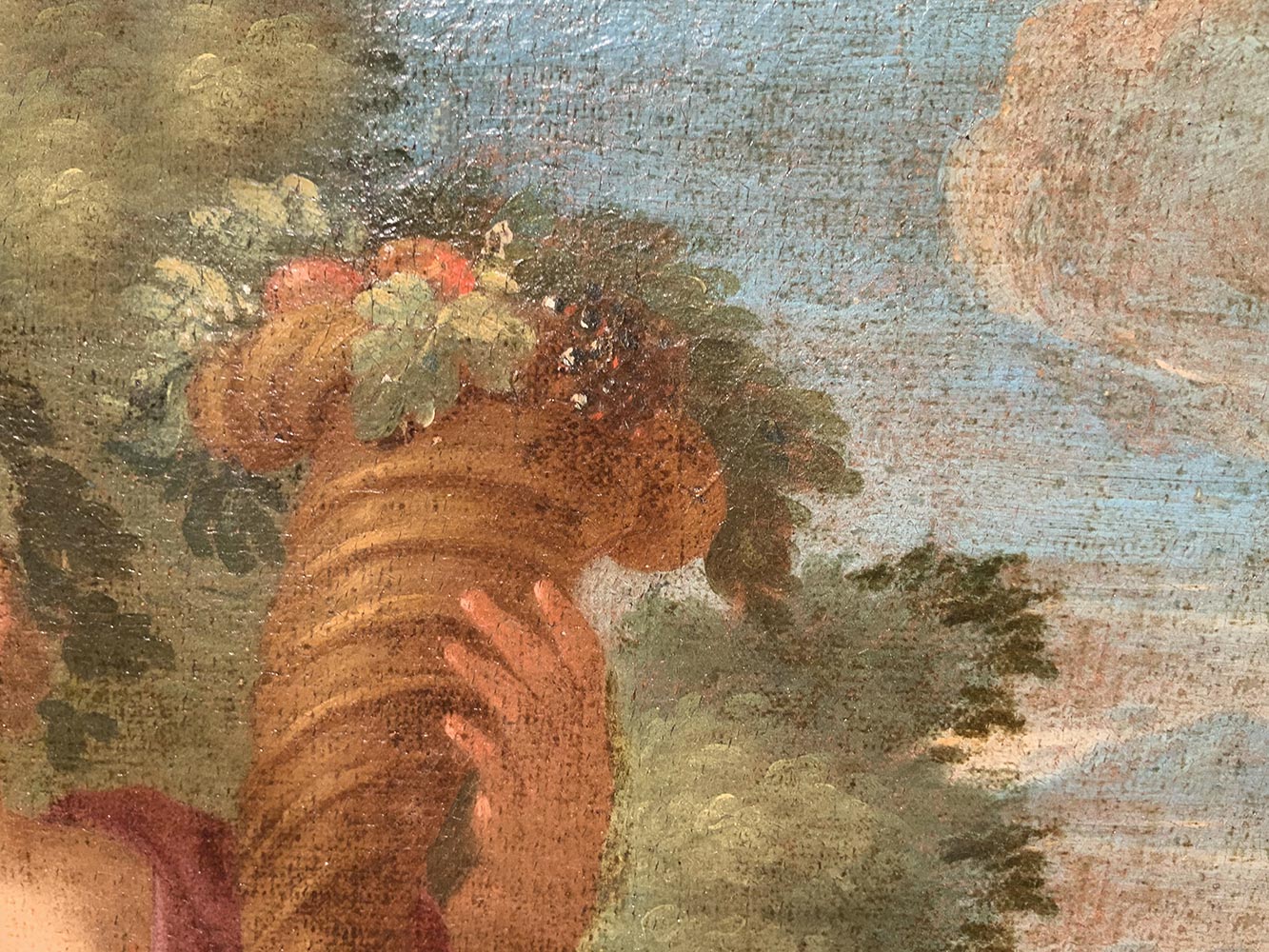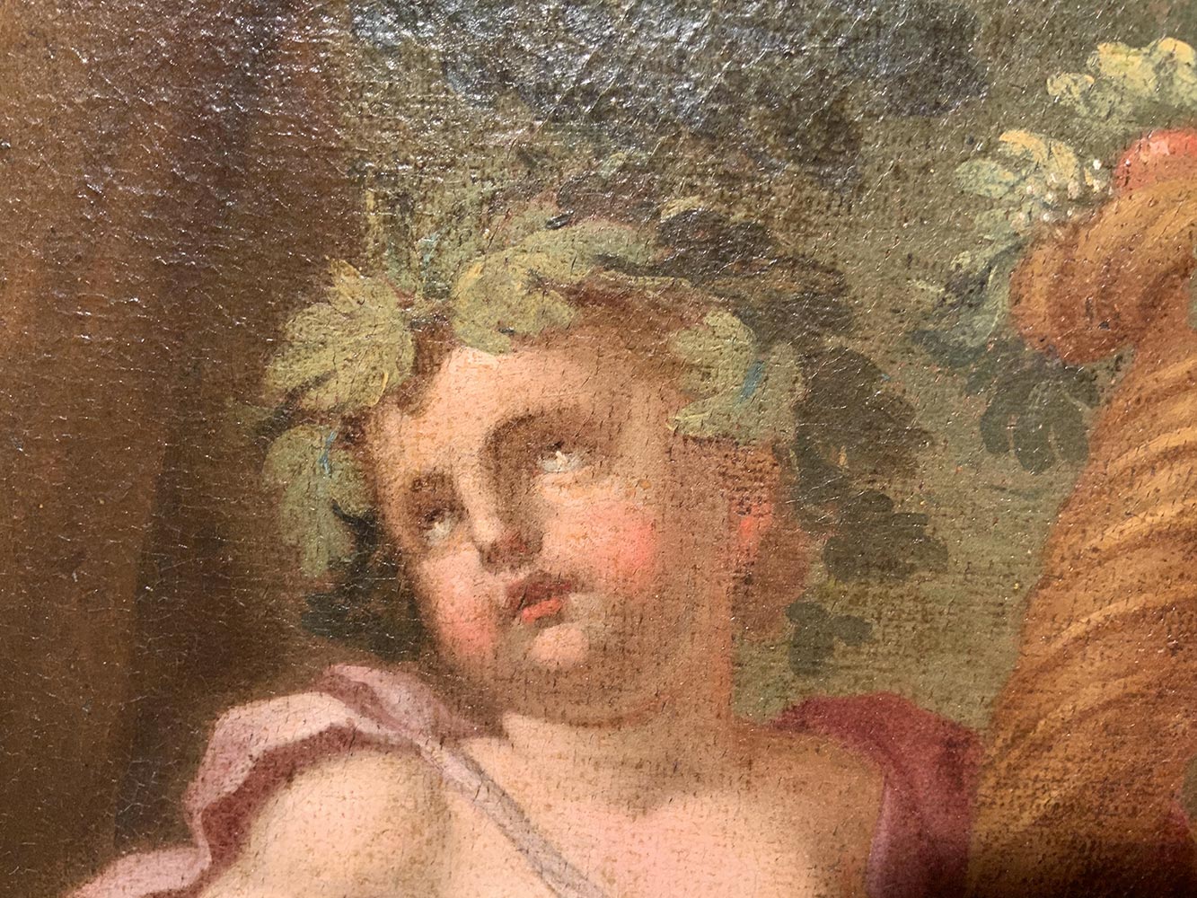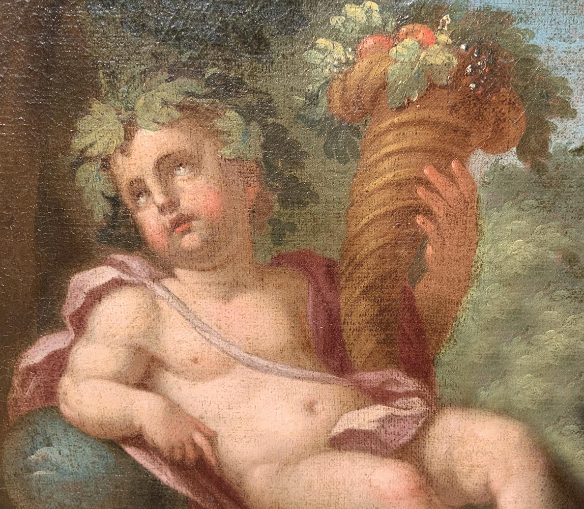 Cerchia di François Boucher (Parigi, 1703 – Parigi, 1770). Putto baccante con cornucopia. 40x34, olio su tela, in cornice 58x52. "Il raffronto del dipinto è possibile con altre opere dove frequenti sono le raffigurazioni di putti zefiri e cherubini. Nell'opera in oggetto ciò che traspare, come in molte altre composizioni, è una sensazione di leggiadria, enfatizzata dall'uso eccezionale della tavolozza il cui uso dei chiari esalta la luminosità. Possiamo dire che essa è un tipico esempio di uno stile Rococò, che in pittura si manifesta interpretando lo spirito della società francese che nel decorativismo lezioso, nell'eleganza e nell'idillio, ricerca un linguaggio più consono a se. Francois Boucher diventò con le sue opere il simbolo della vita a cui anelava la classe aristocratica. La sua bottega dedicò gran parte della propria attività a soddisfare le copiose richieste. La presente tela, collocabile nella seconda metà del XVII secolo si può pertanto attribuire a un suo allievo o assistente di bottega."STUDIO ASOR