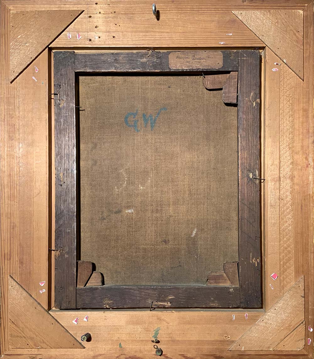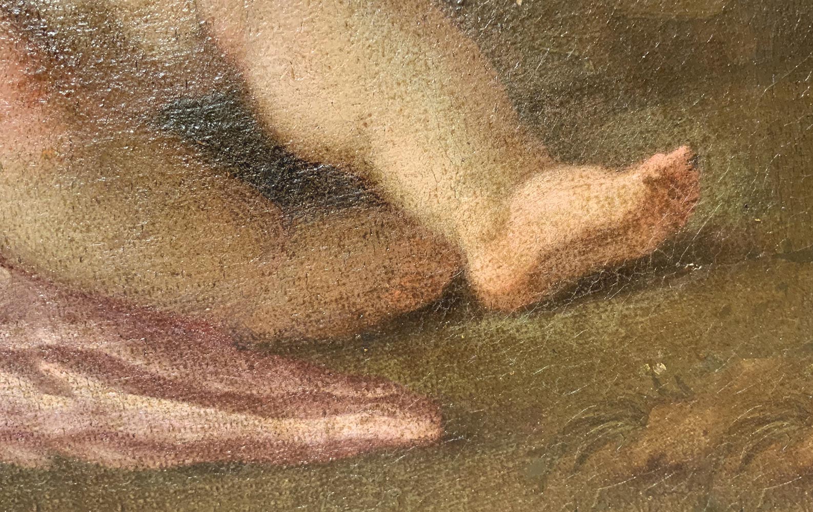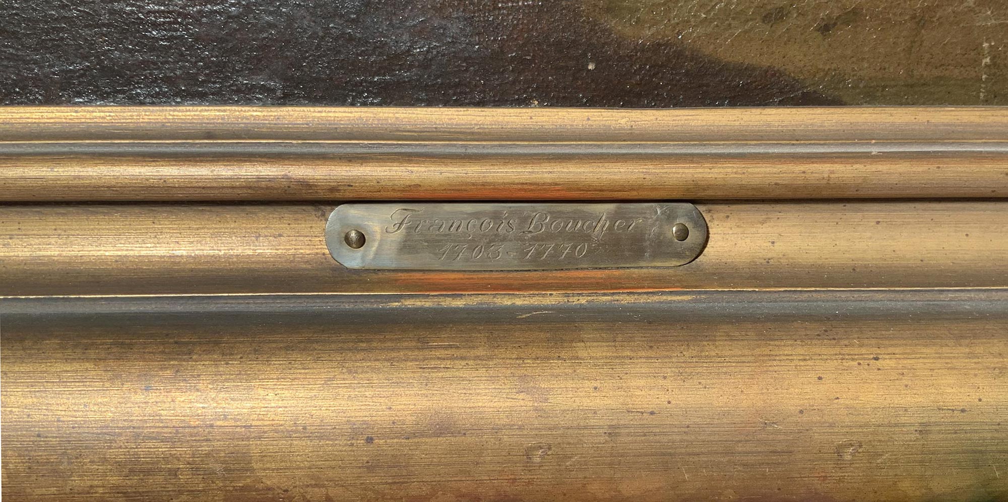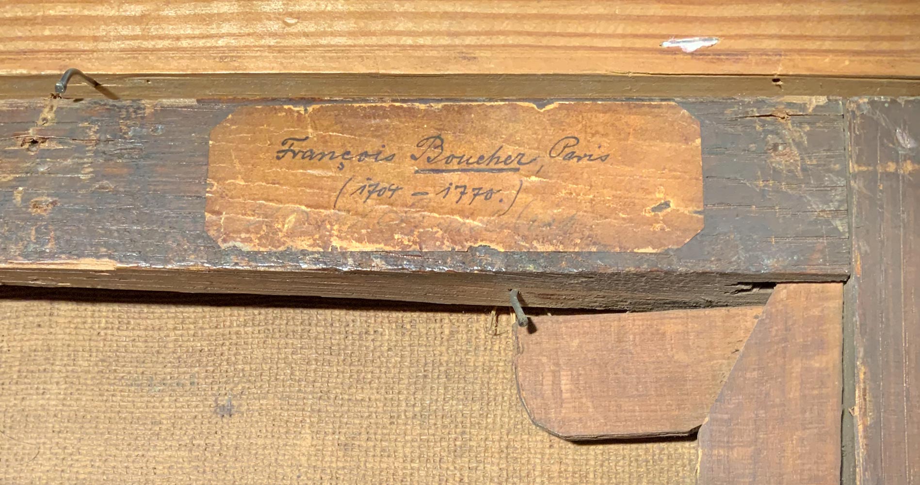 Cerchia di François Boucher (Parigi, 1703 – Parigi, 1770). Putto baccante con cornucopia. 40x34, olio su tela, in cornice 58x52. "Il raffronto del dipinto è possibile con altre opere dove frequenti sono le raffigurazioni di putti zefiri e cherubini. Nell'opera in oggetto ciò che traspare, come in molte altre composizioni, è una sensazione di leggiadria, enfatizzata dall'uso eccezionale della tavolozza il cui uso dei chiari esalta la luminosità. Possiamo dire che essa è un tipico esempio di uno stile Rococò, che in pittura si manifesta interpretando lo spirito della società francese che nel decorativismo lezioso, nell'eleganza e nell'idillio, ricerca un linguaggio più consono a se. Francois Boucher diventò con le sue opere il simbolo della vita a cui anelava la classe aristocratica. La sua bottega dedicò gran parte della propria attività a soddisfare le copiose richieste. La presente tela, collocabile nella seconda metà del XVII secolo si può pertanto attribuire a un suo allievo o assistente di bottega."STUDIO ASOR