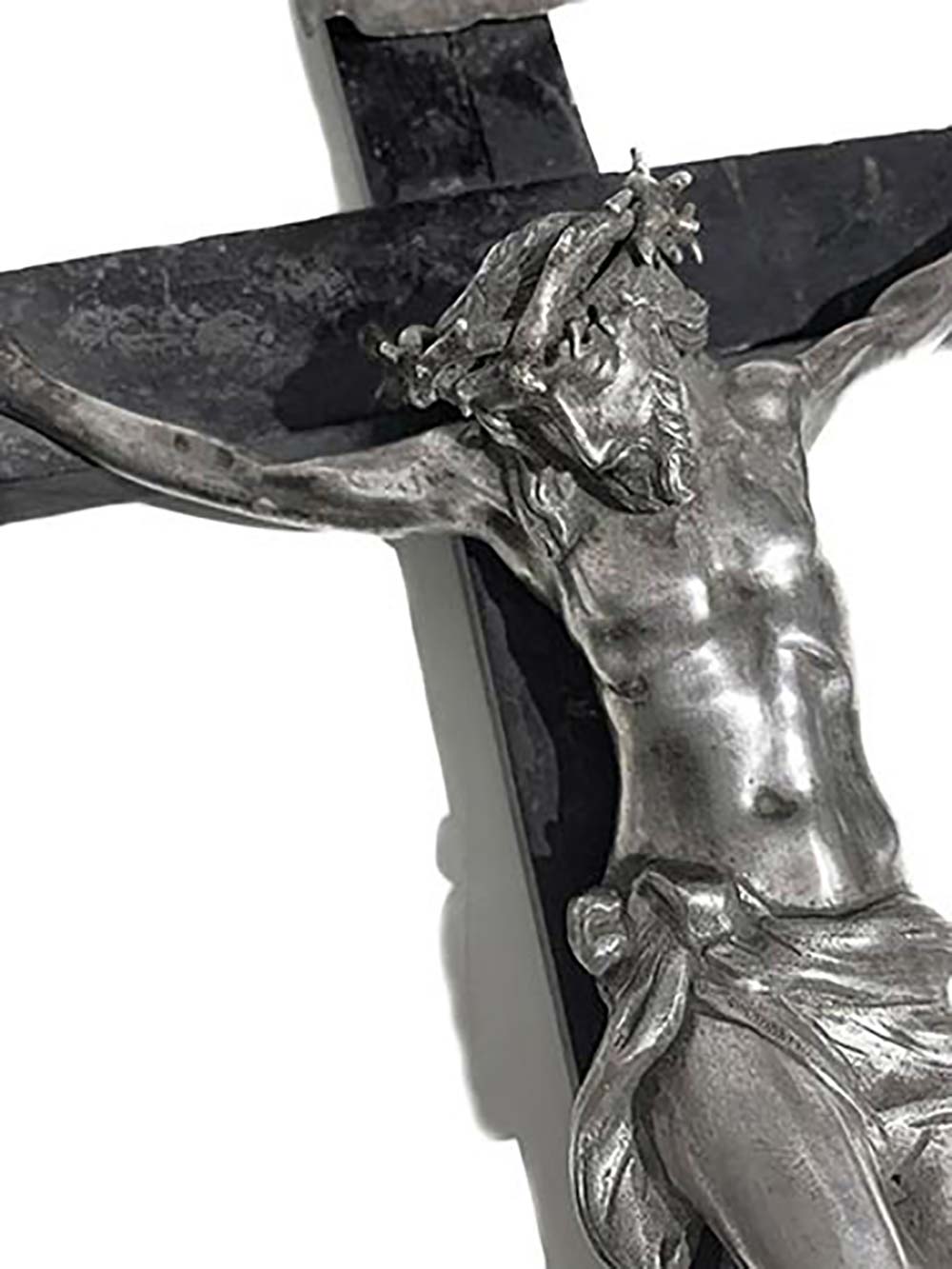 Cristo in argento su croce in legno, 1765. Punzonato Messina PL (Console Placido Lancella). Cm 46x28