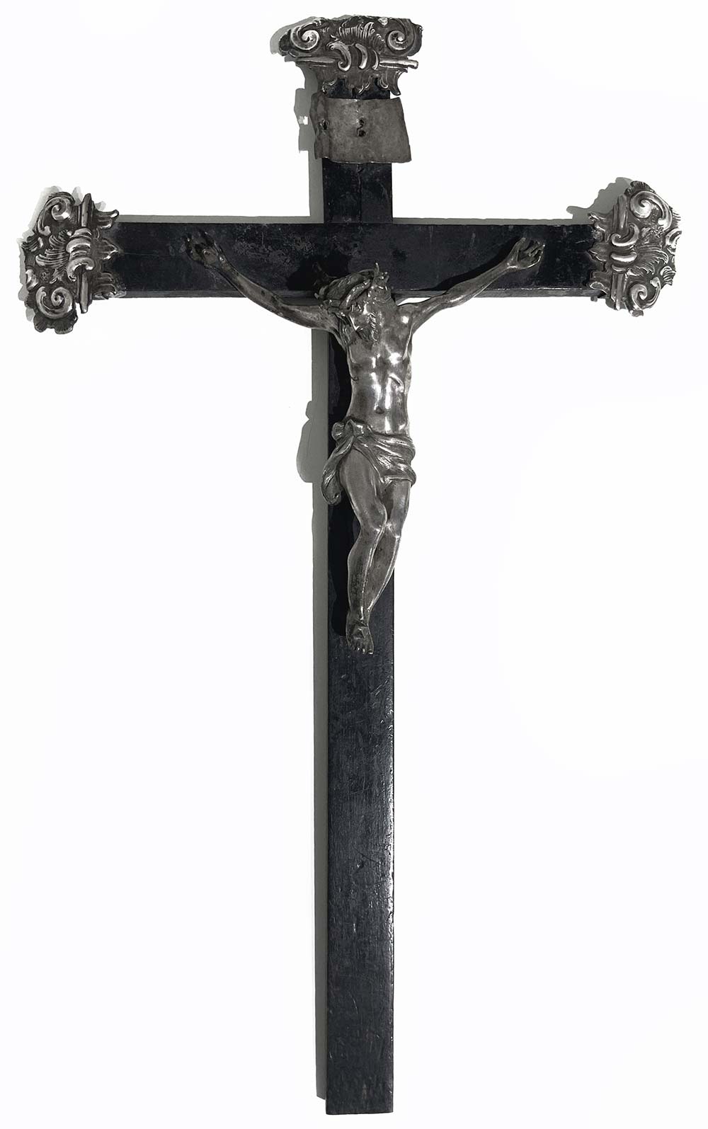 Cristo in argento su croce in legno, 1765. Punzonato Messina PL (Console...