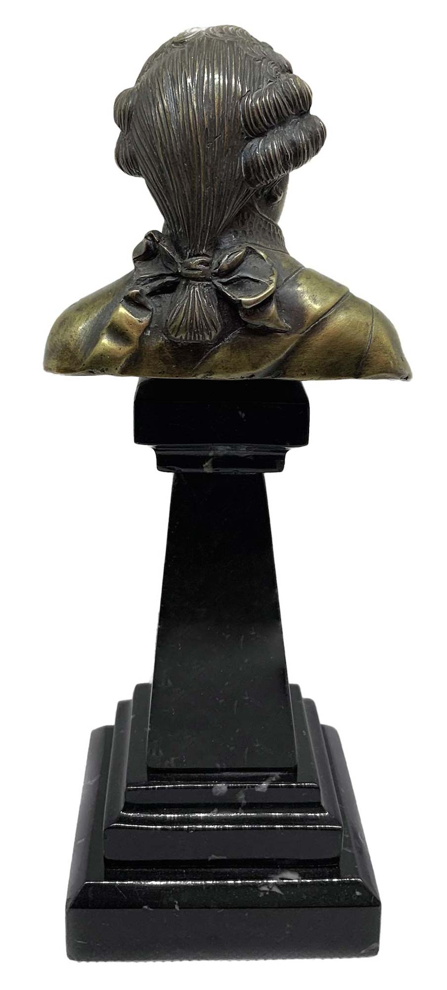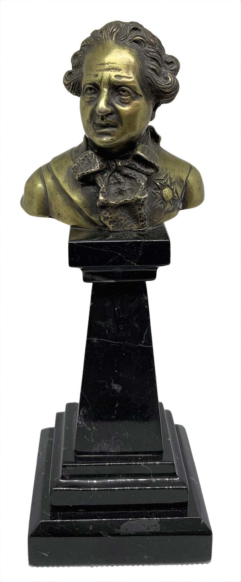 Mezzobusto di personaggio settecentesco, XIX secolo, uomo. su base in marmo troncopiramidale. H cm 23.