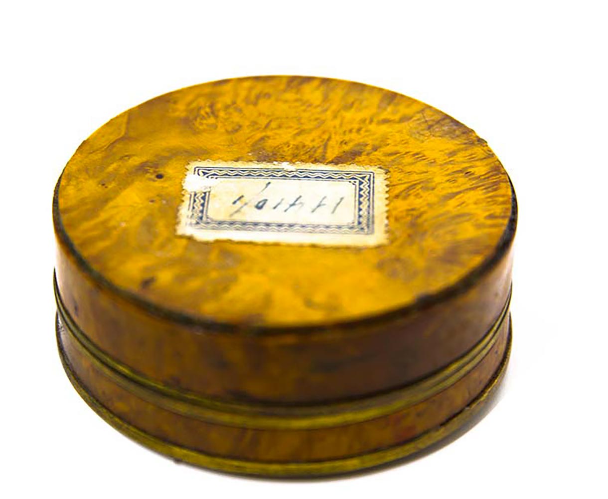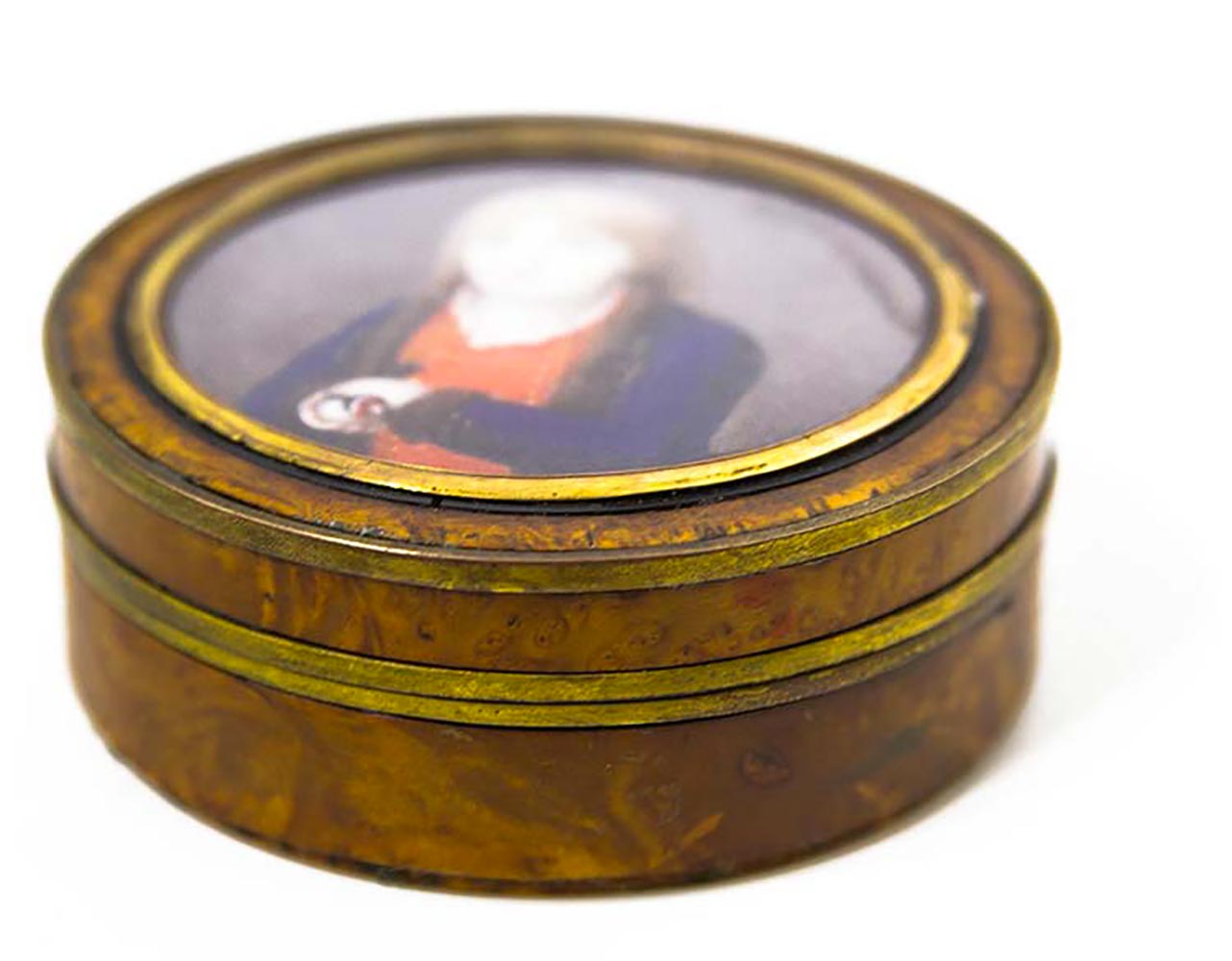 Tabacchiera in radica di ulivo, interno in tartaruga con miniatura...