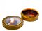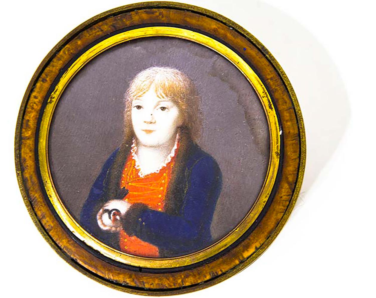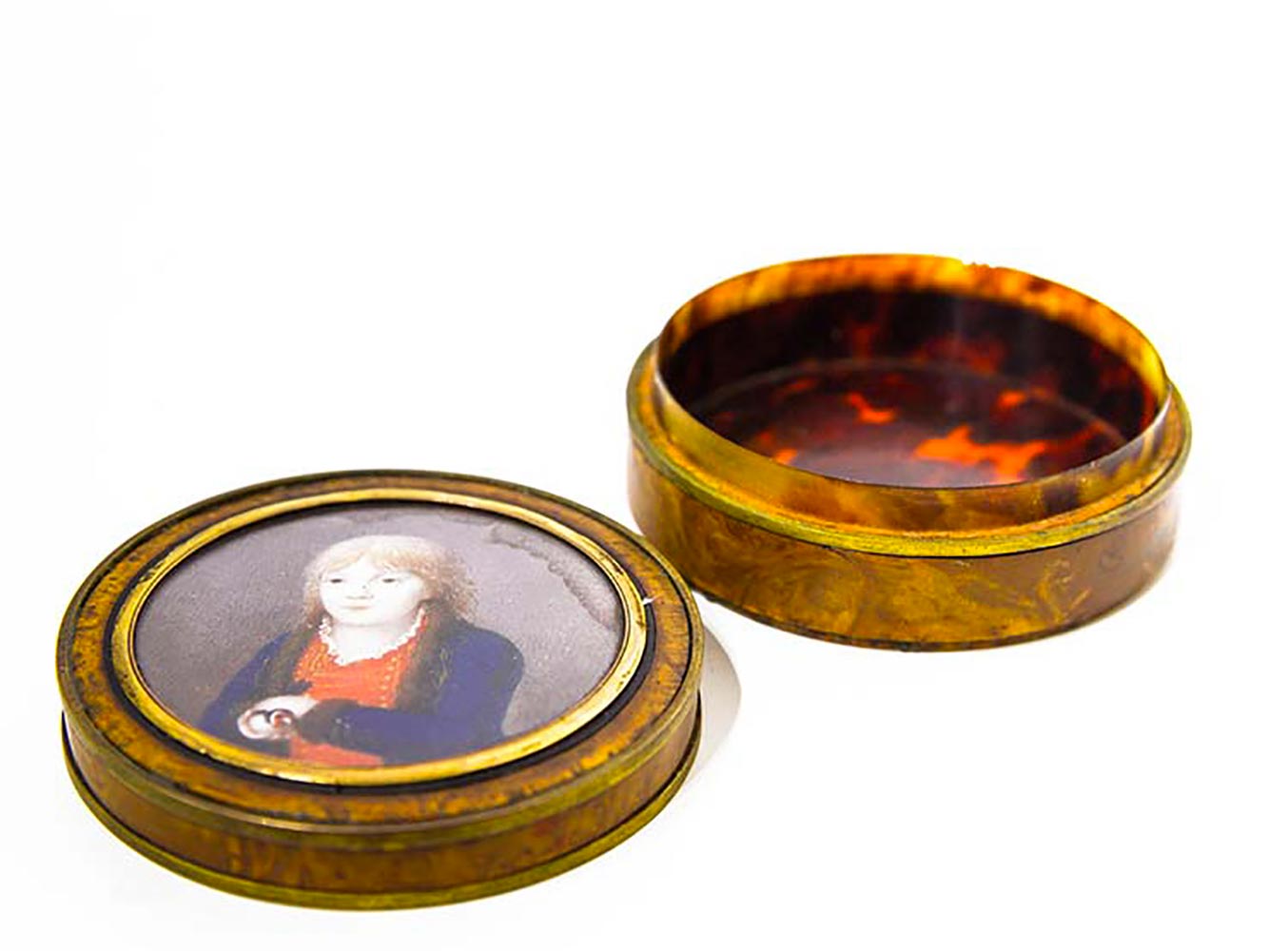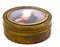 Tabacchiera in radica di ulivo, interno in tartaruga con miniatura raffigurante bimbo con cardellino. Diametro 7,5