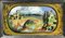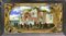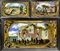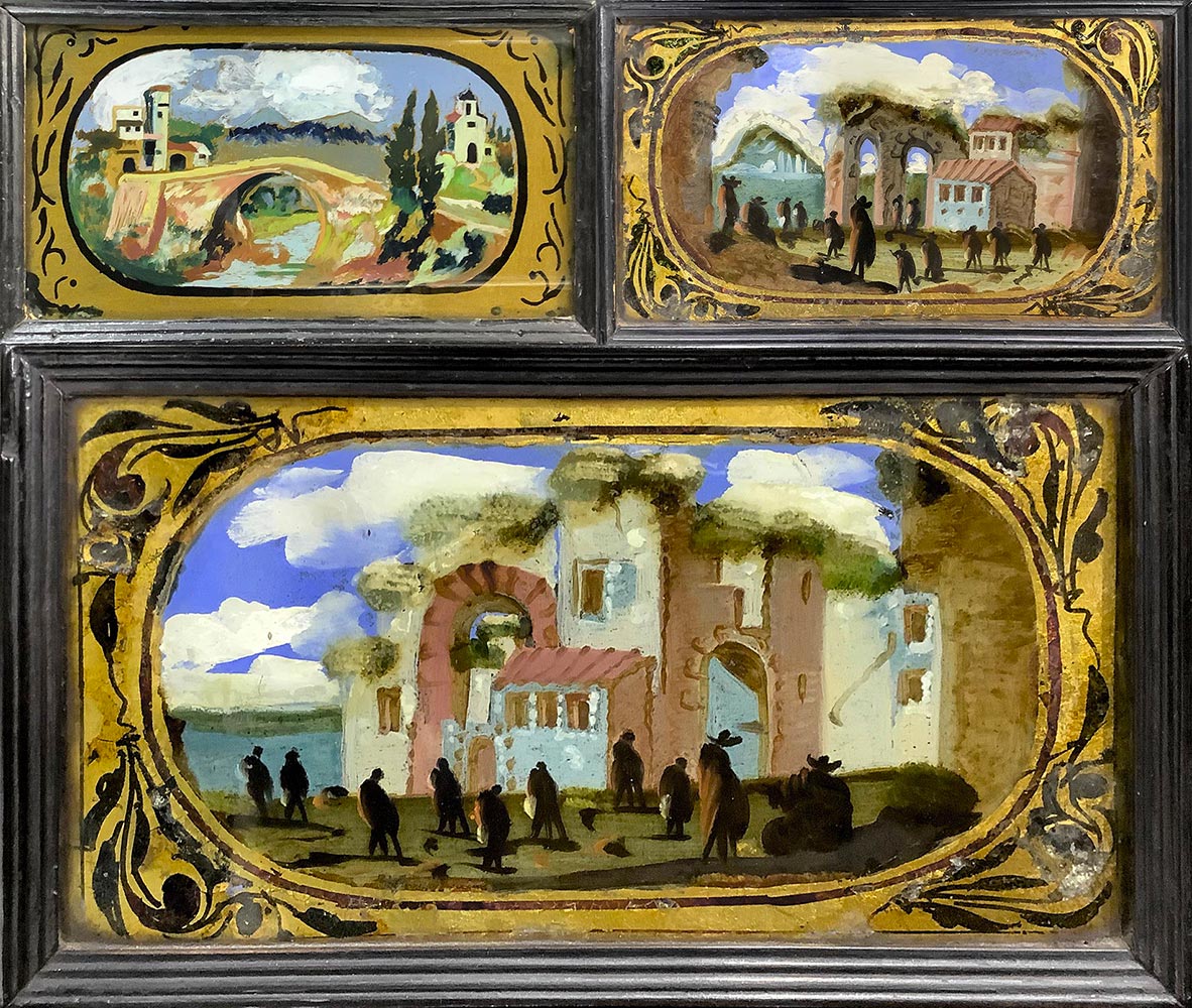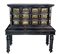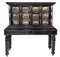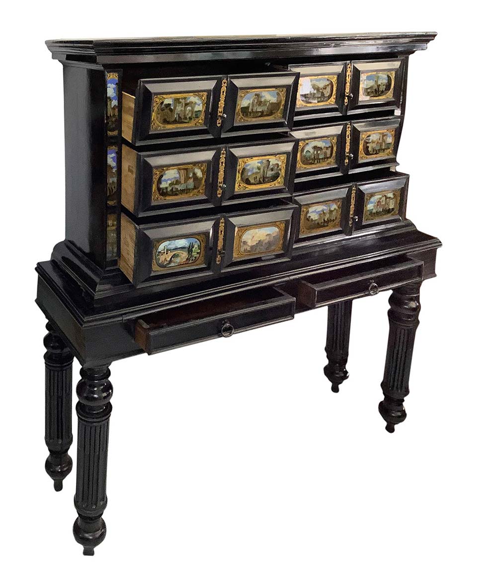 Monetiere in legno nero ebanizzato a due corpi, XVIII secolo. 12 formelle ai cassetti con pitture su vetro raffiguranti paesaggi con architetture. Avente come base tavolo in legno ebanizzato, XIX secolo. H Cm 162. Cm 150x45
