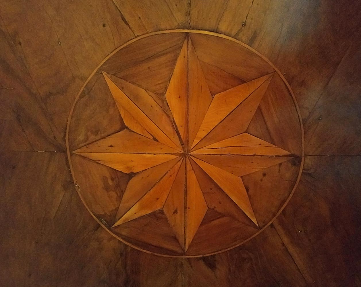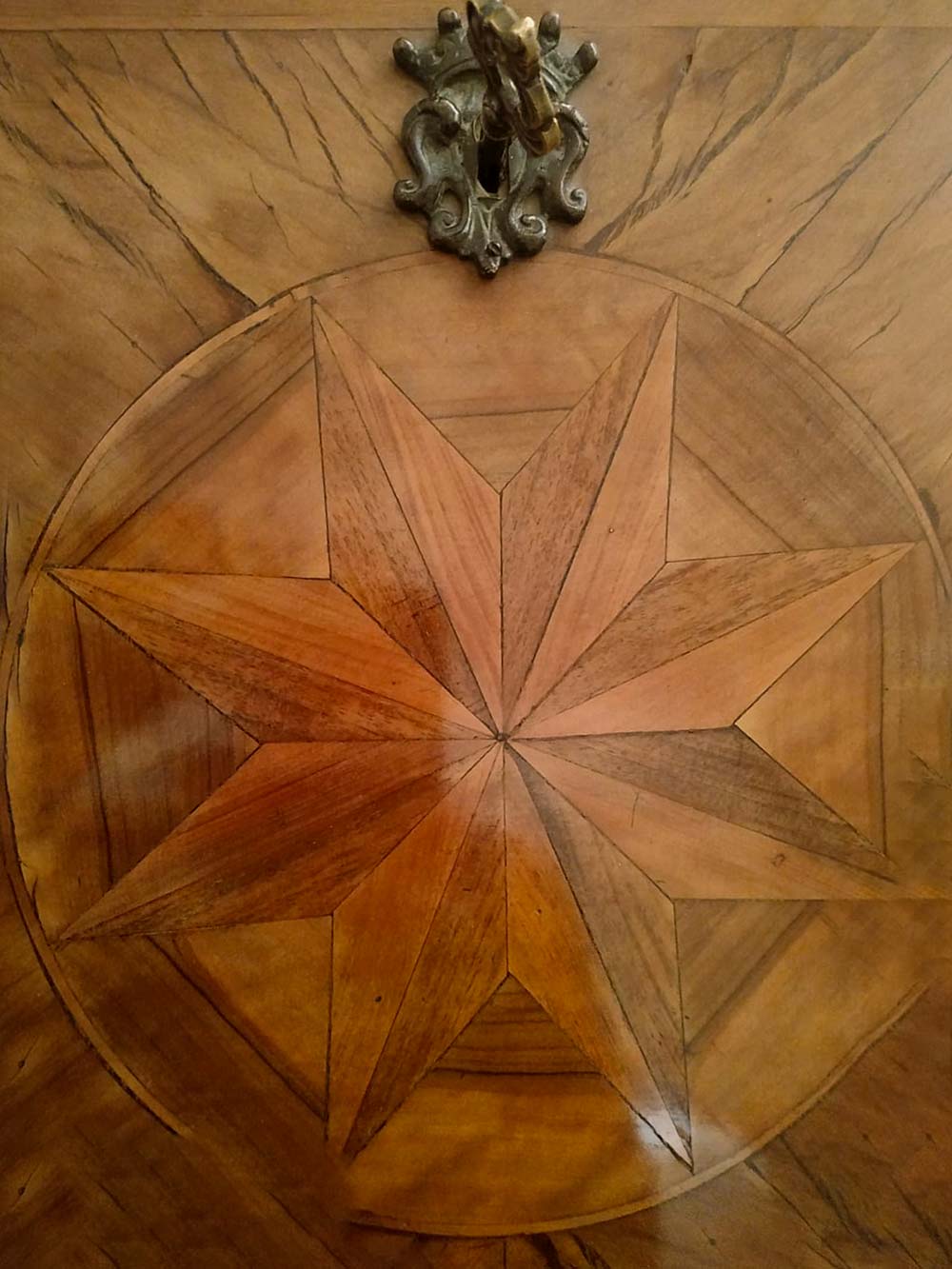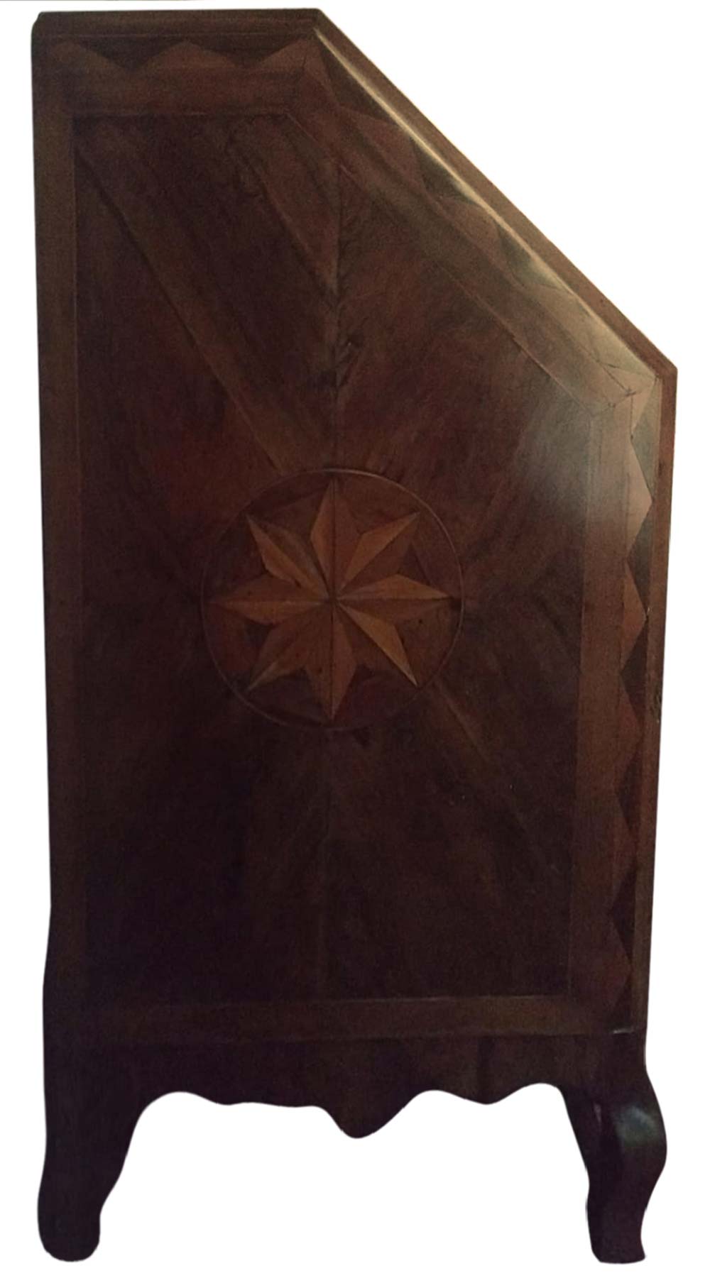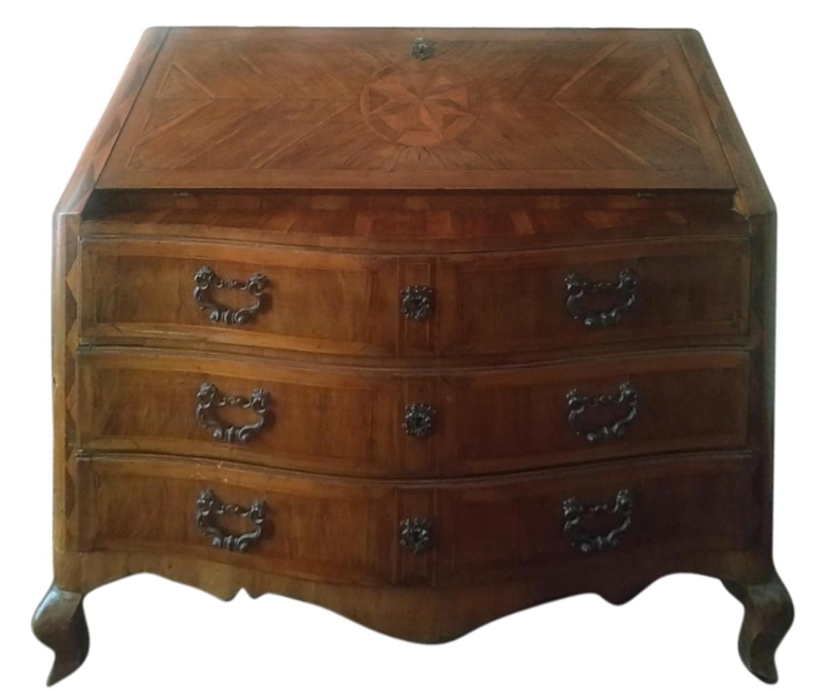 Ribalta maltese, secolo XVIII. Lastronata in noce con inserti in palissandro e legni chiari. Antichi restauri degli anni 50/70. H cm 120x110x55.
