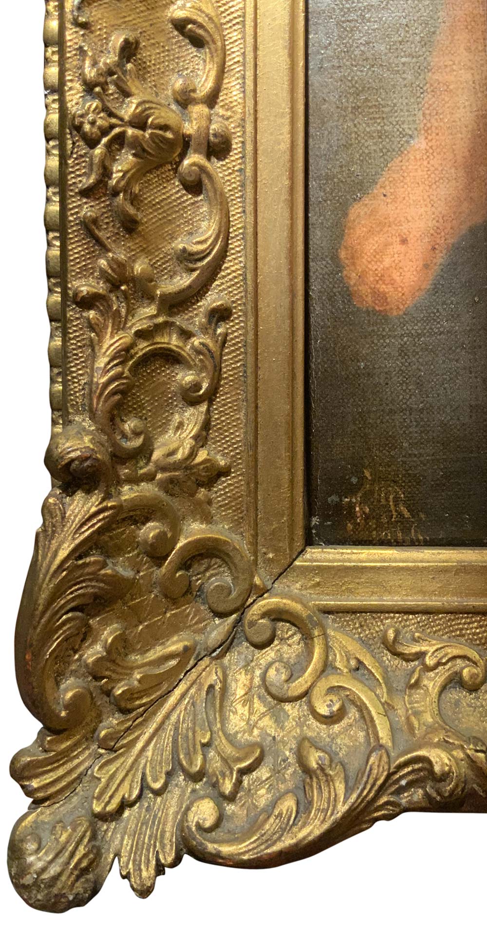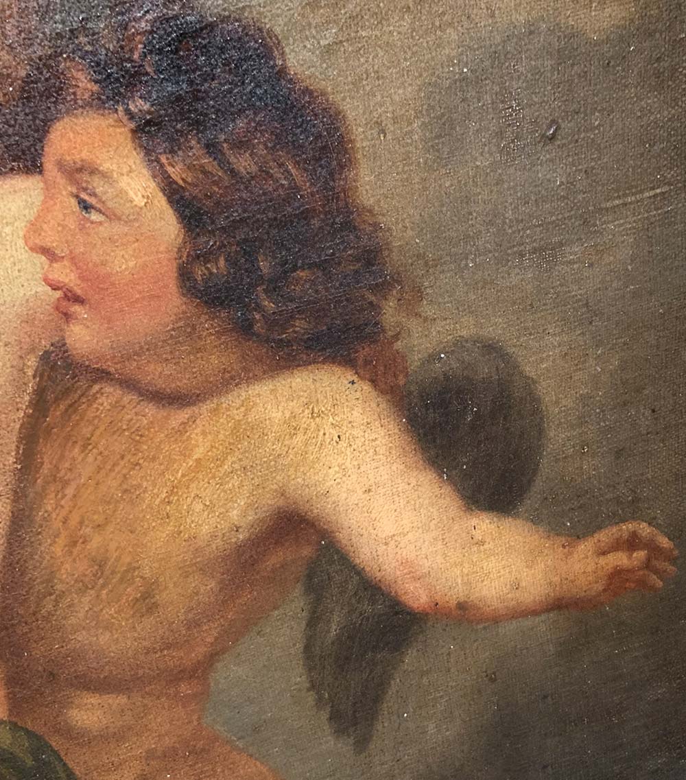 Pittore del XIX secolo di scuola rubensiana. Angioletti in volo. 45x35, olio su tela. Firmato con monografia F.R. e datato 1866 in baso a sinistra. In bella cornice in legno dorato a foglia.