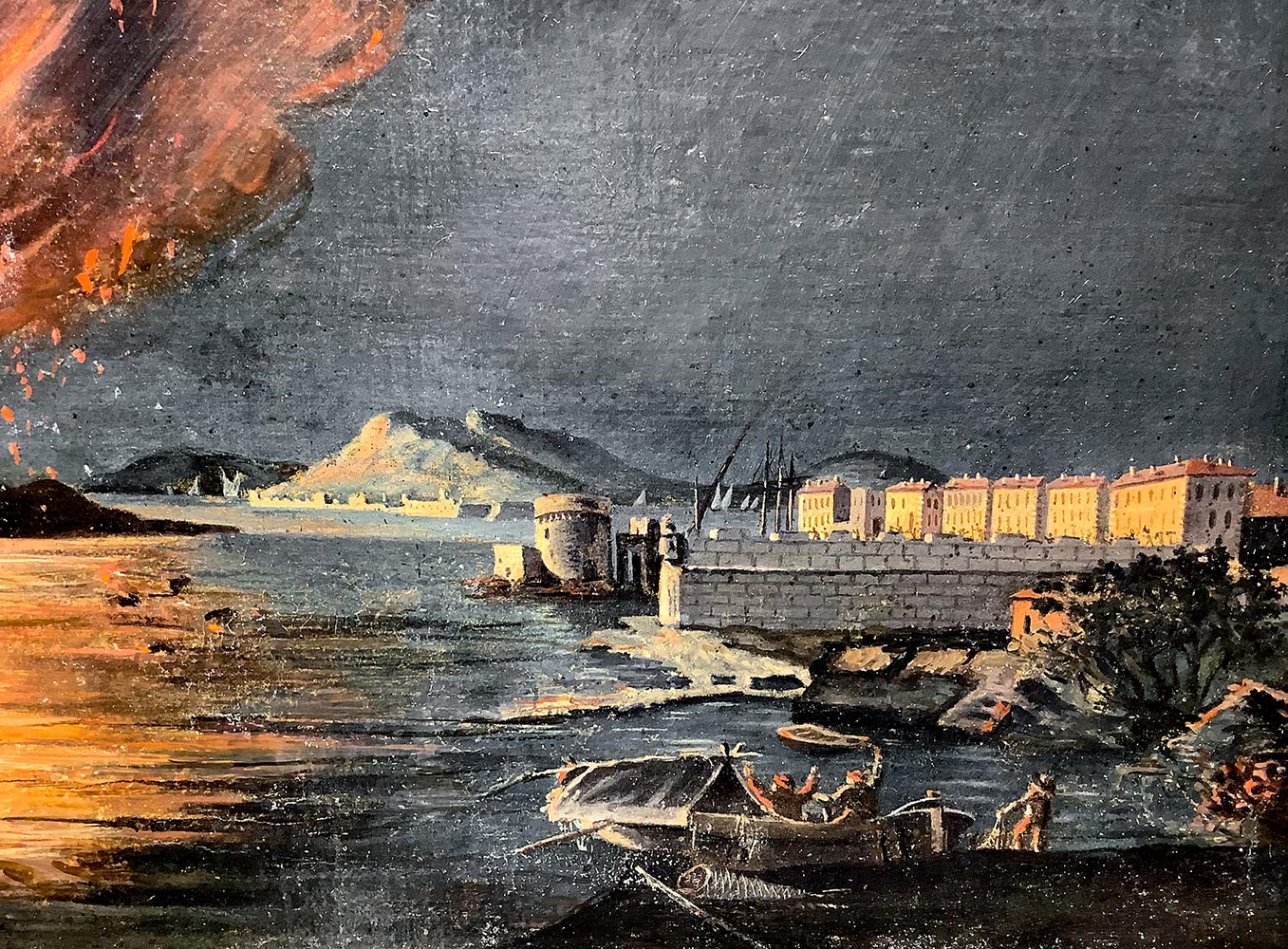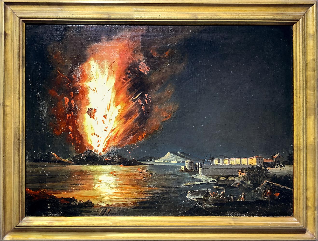 Pittore del XIX secolo. Eruzione vulcanica. 45x60, olio su tela. Firmato in basso a sinistra Josef Ine.