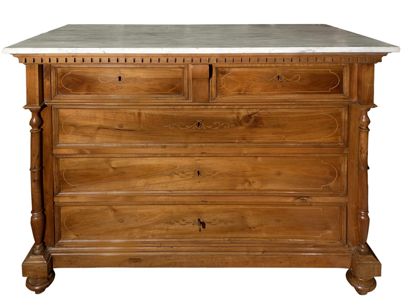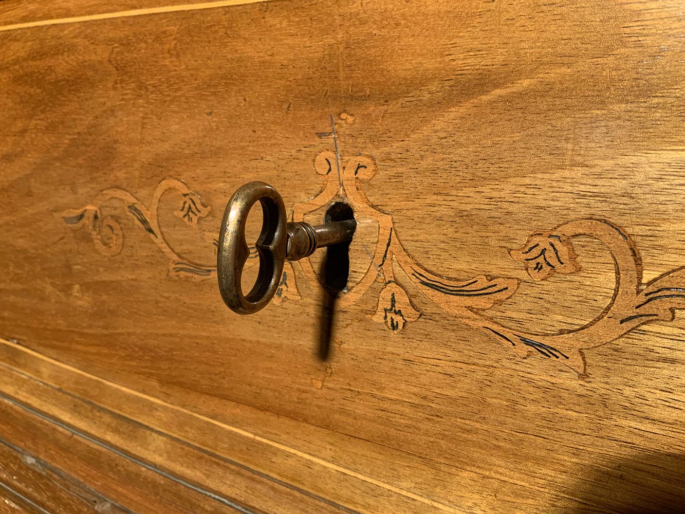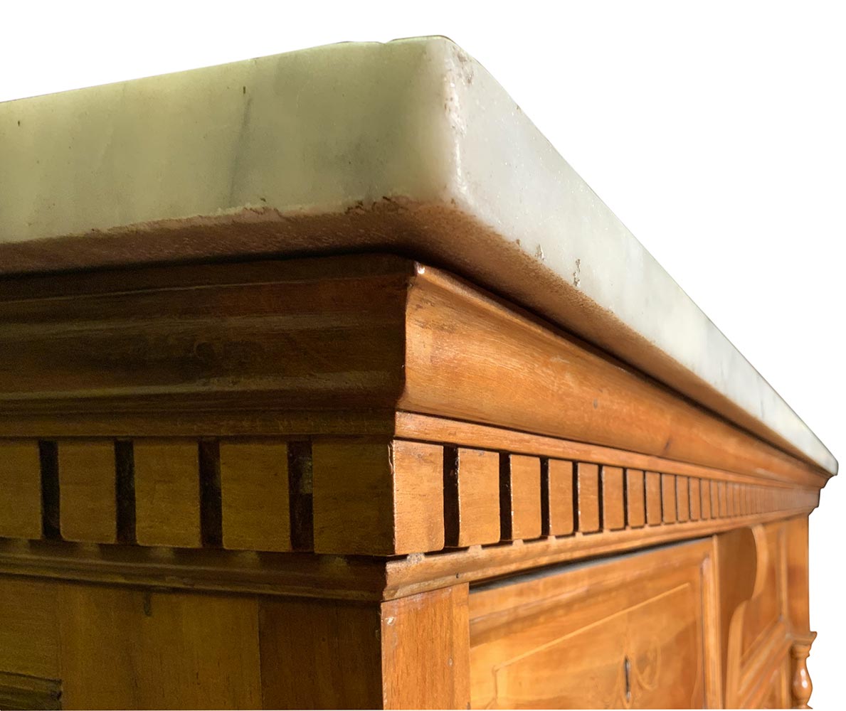 Cassettone, Sicilia, XIX secolo. In legno di noce con intarsi. H cm 109x123x70.