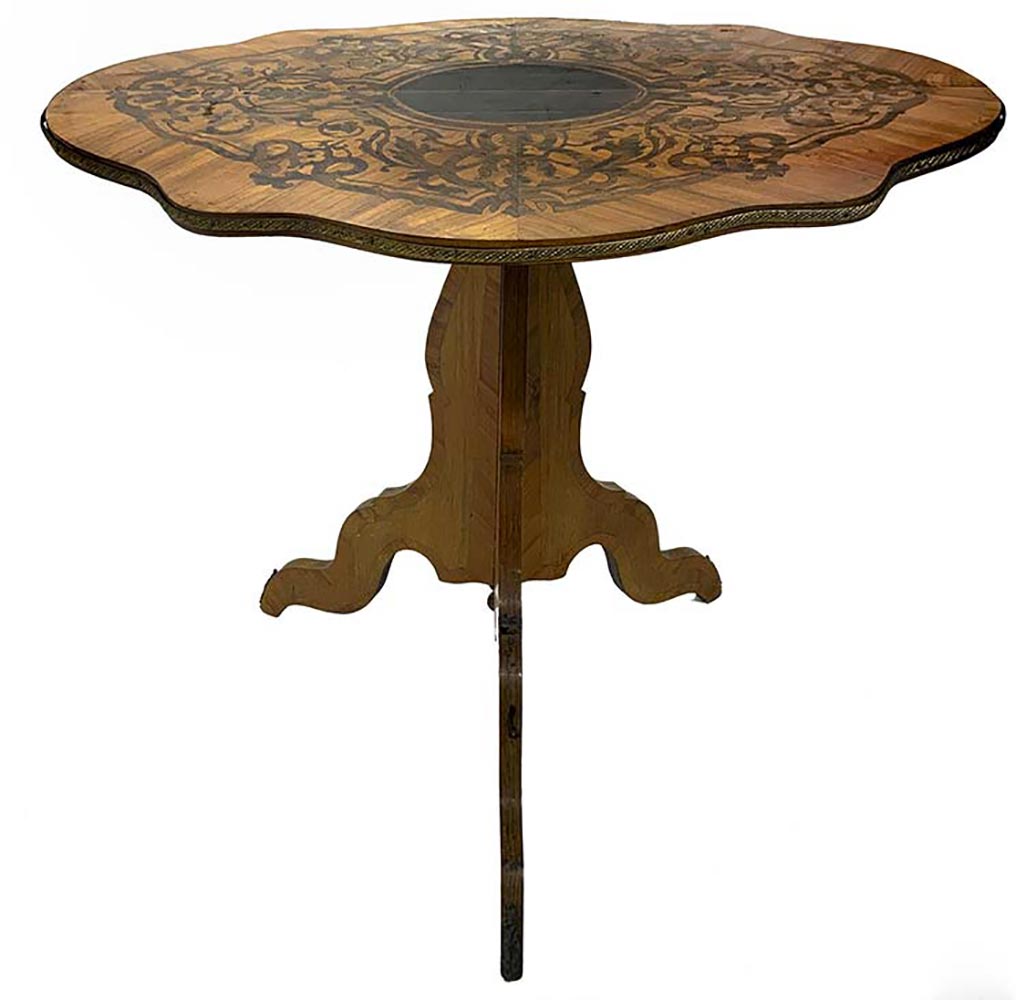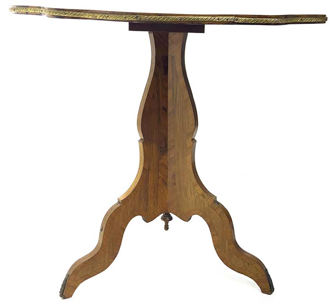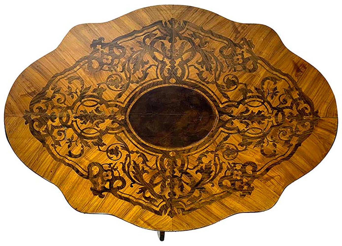 Tavolo ovale smerlato in bois de rose, intarsi in palissandro. XIX Secolo. H cm 71, cm 73x60