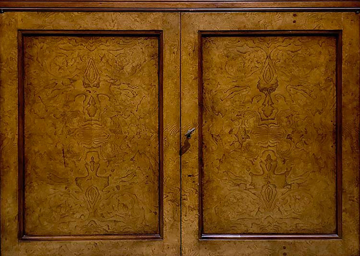 Libreria degli inizi del XX secolo. A doppio corpo in legno di radica chiara (acero). Parte superiore con spazi mensolati, parte inferiore con chiusura a 4 ante. H cm 220x195x35.