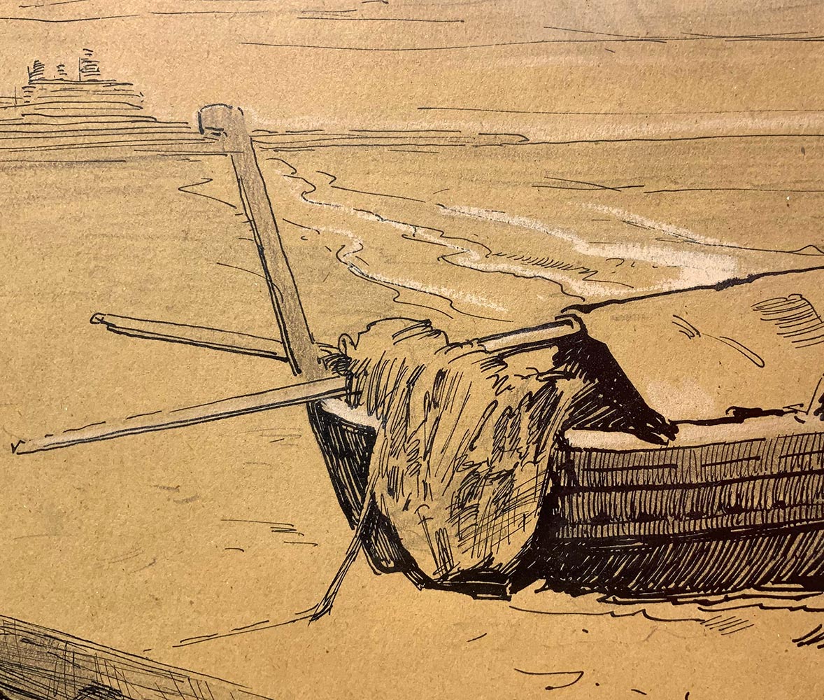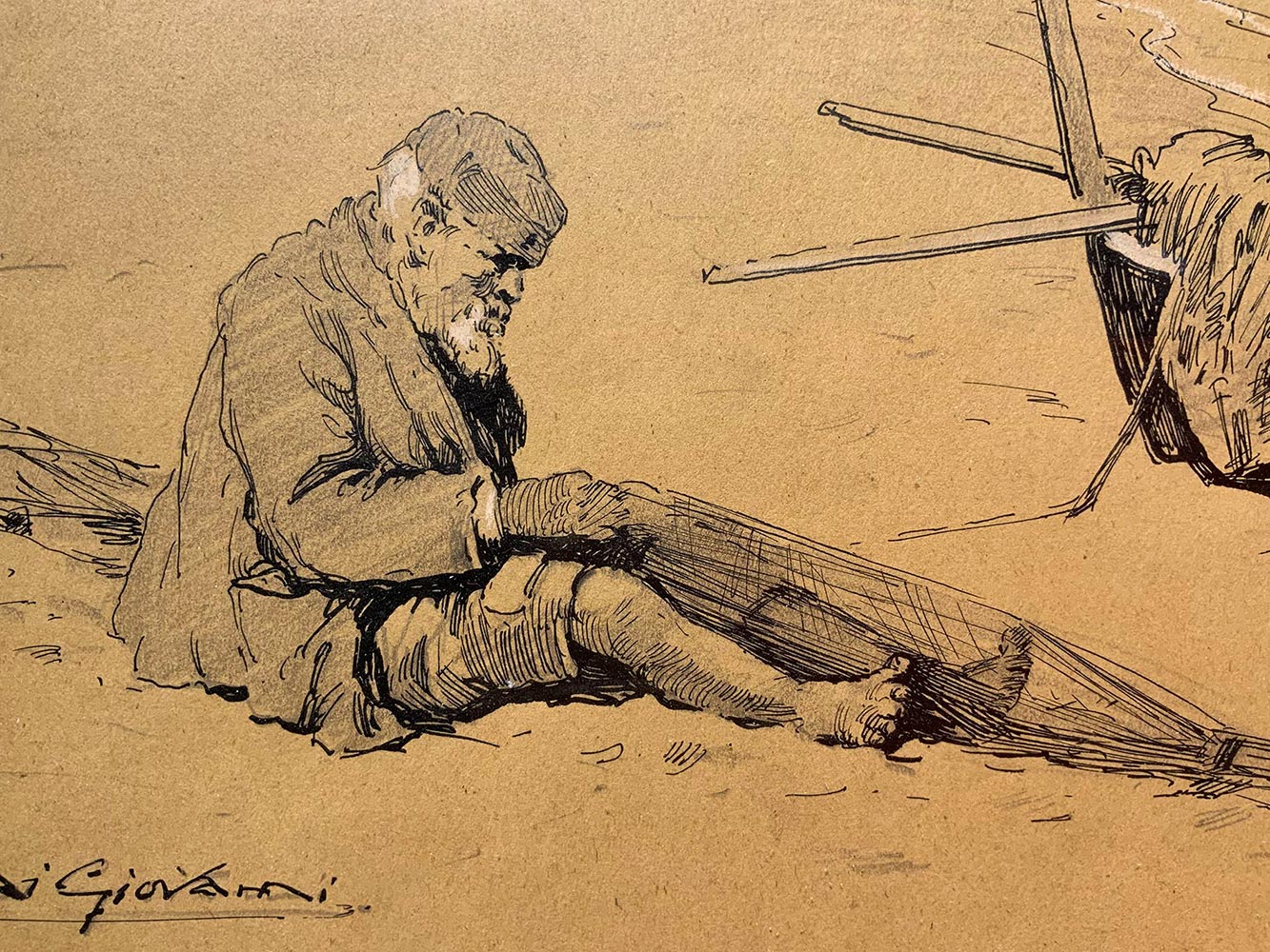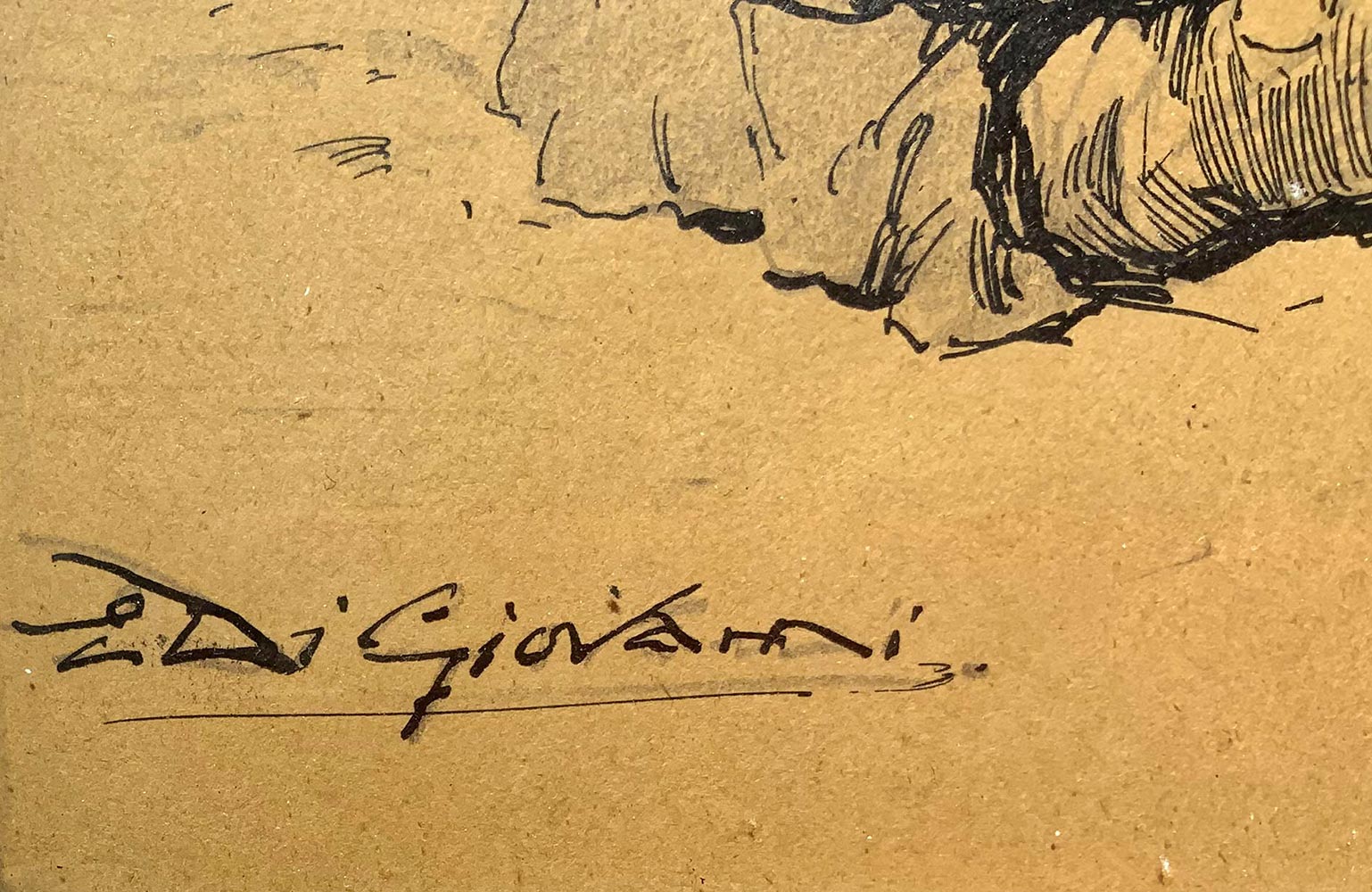 Emanuele Di Giovanni (Catania, 1887 – Catania, 1979). Pescatore con le reti. 24x30, tecnica mista: disegno a china, tempera e biacca. Firmato in basso a sinistra. "Allievo di Antonio Gandolfo (1841-1910) e Nitto Condorelli (Catania, 1878 - Catania, 1950). Dimostrò grande talento precocemente, tanto da esporre nel 1907 all'esposizione agricola siciliana. Divenuto noto come ritrattista ebbe richieste da tutta la borghesia catanese. Numerosi sono anche i ritratti della galleria dei sindaci al comune di Catania."STUDIO ASOR