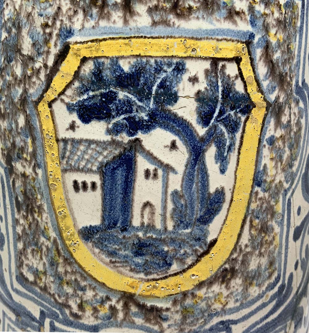 Cilindro in maiolica di Caltagirone, Sicilia XVIII secolo. A fondo bianco con riserva centrale raffigurante paesaggio, contornato da manganese. H cm 31x15. Filato.