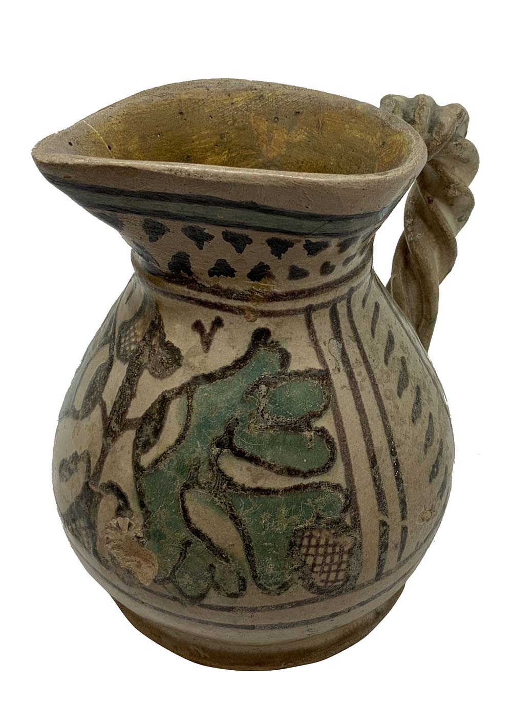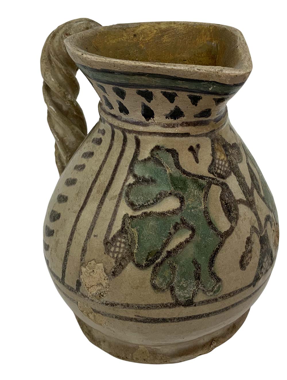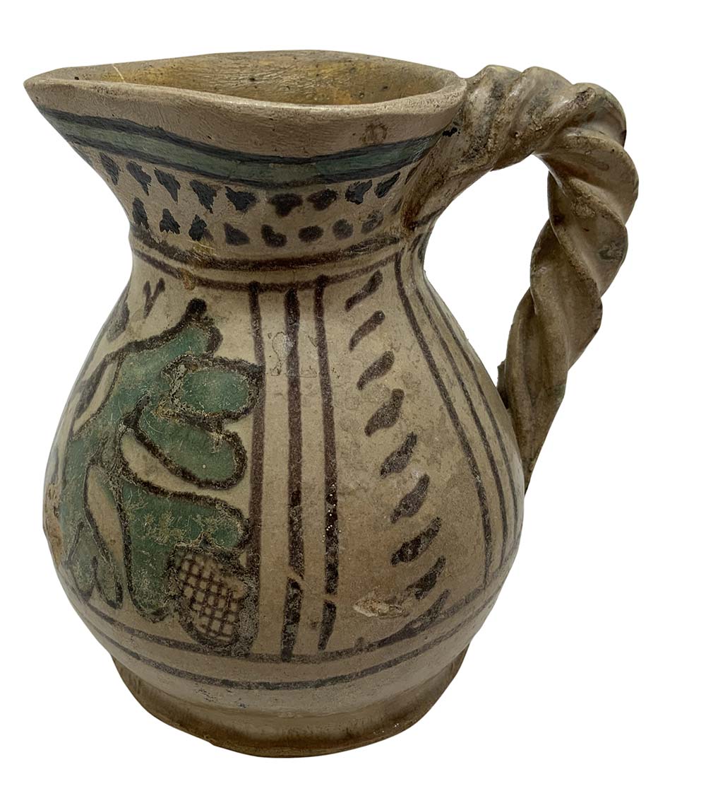 Protomaiolica di Caltagirone, officine Calatine XV/XVI secolo. Versatoio con manicho torchon. Piccoli restauri alla bocca. H cm 13, diametro cm 8.