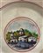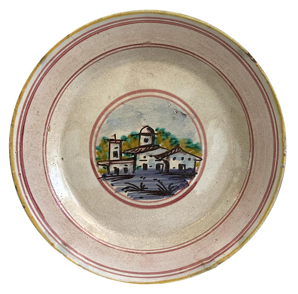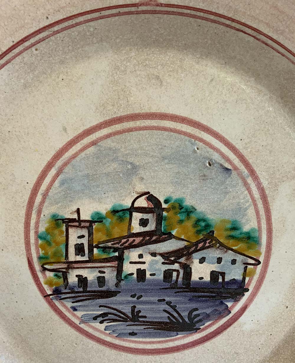 Grande piatto da parete in maiolica di Caltagirone, Sicilia fine XIX, inizi XX secolo. Raffigurante case. Diametro cm 43.