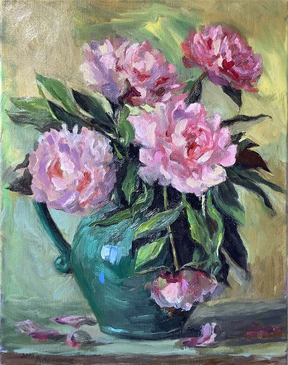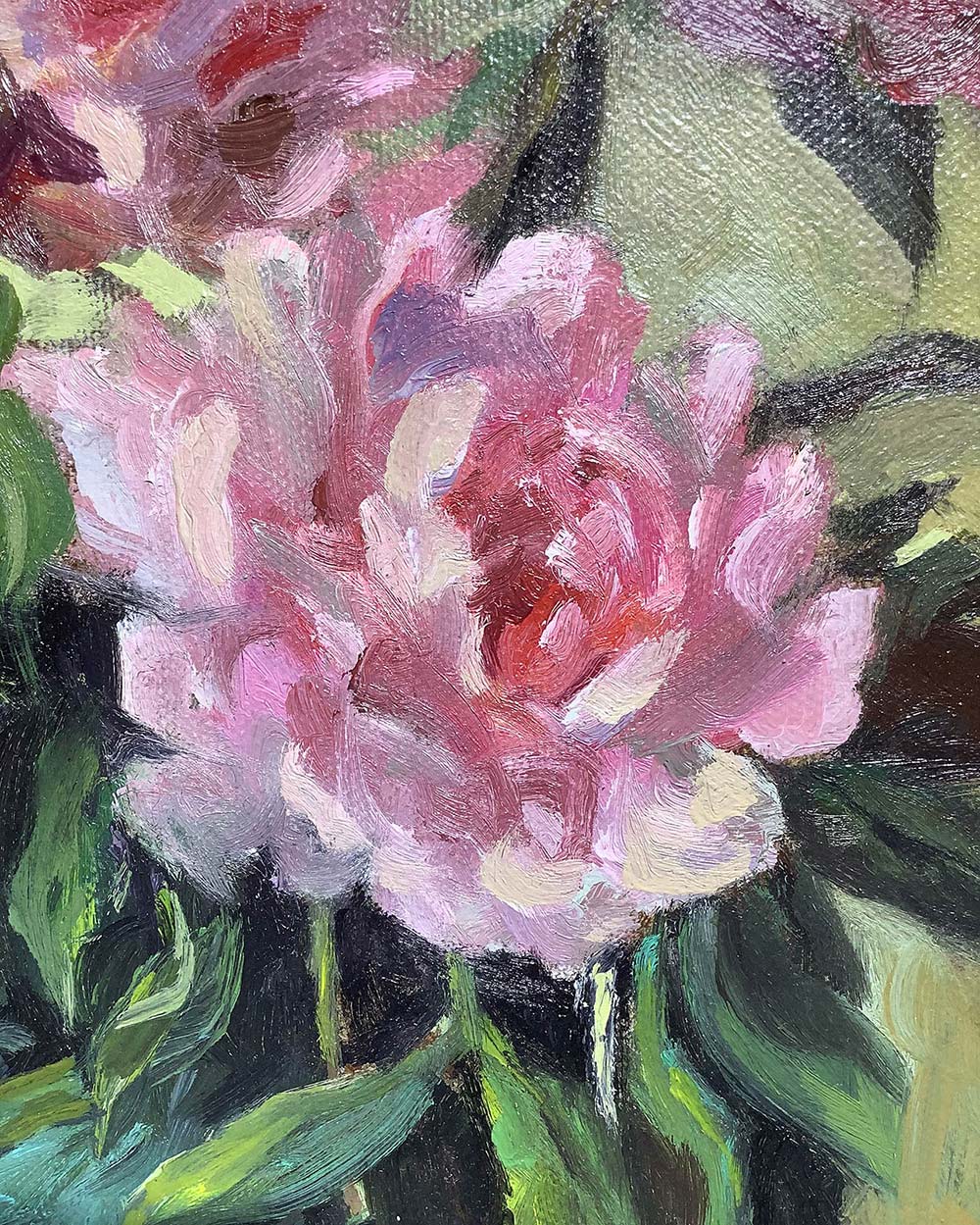Viktoriya Kalenik ( Bielorussia, 1991). Natura morta di fiori "Peonia". 40x30, olio su tela. Firmato e datato in basso a destra.