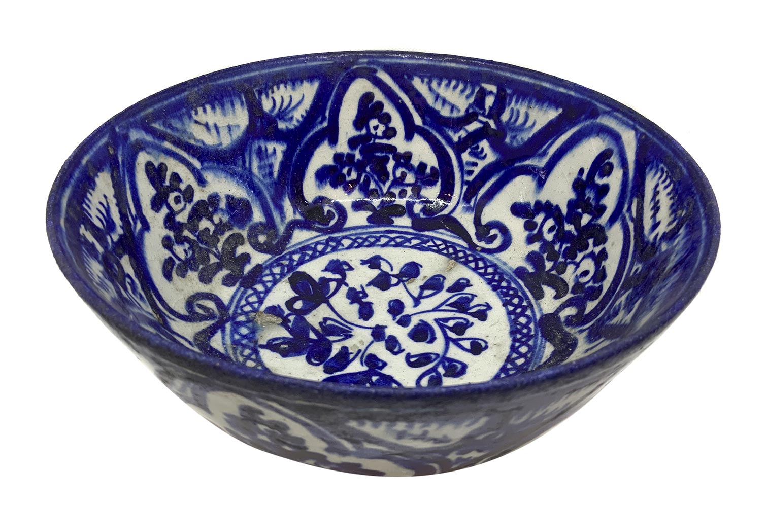 Ciotola in maiolica, XVIII secolo, Islam. Fondo bianco, dipinta con motivi floreali. Hcm 10, base cm 9, bocca cm 22.