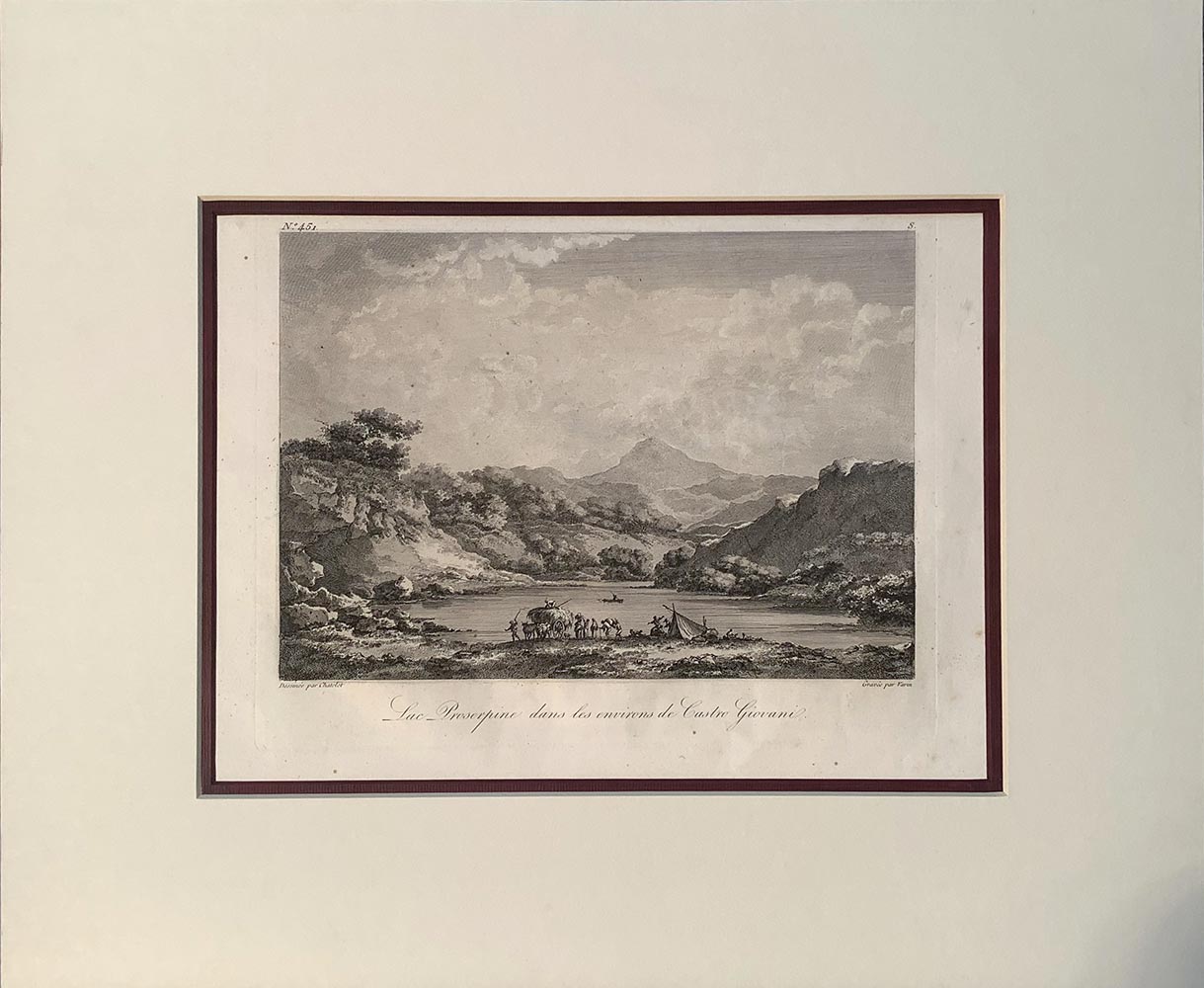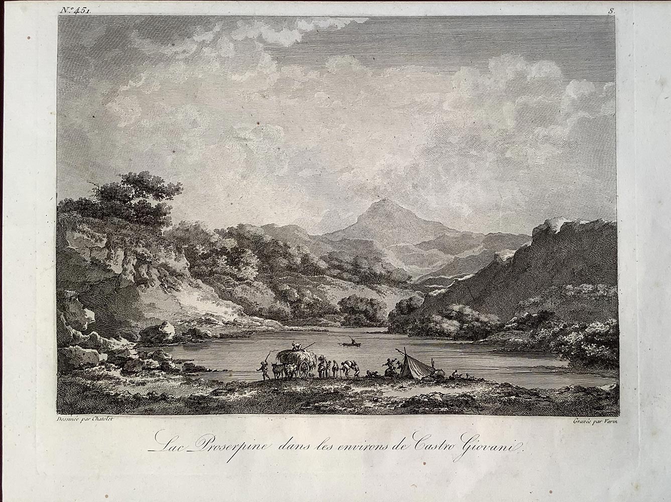 Varin (1740-1800 Parigi). Vista del Lago di Proserpina (oggi Pergusa) presso Castrogiovanni (Enna). Incisione all'acquaforte. Disegnatore di Chatelet (1753-1794 Parigi) Opera storica locale della fine del XVIII secolo. Tratta da "Voyage pittoresque ou Description des royaumes de Naples et de Sicile" di Jean-Claude Richard de Saint-Non, meglio noto come Abate di Saint-Non (1727-1791).