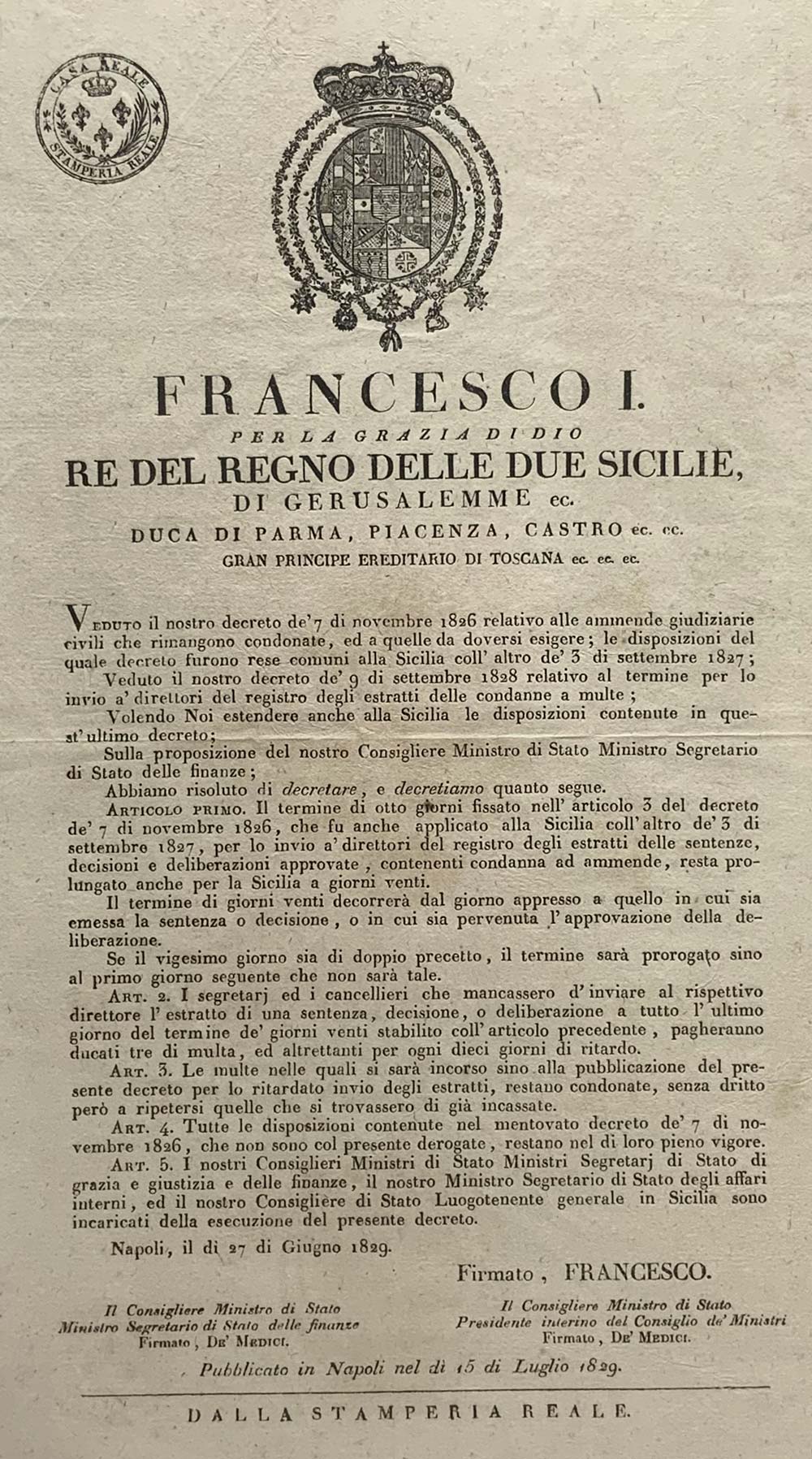 Decreto Reale 1829 di Francesco I, Re del Regno delle due Sicilie. Cm 40x25....