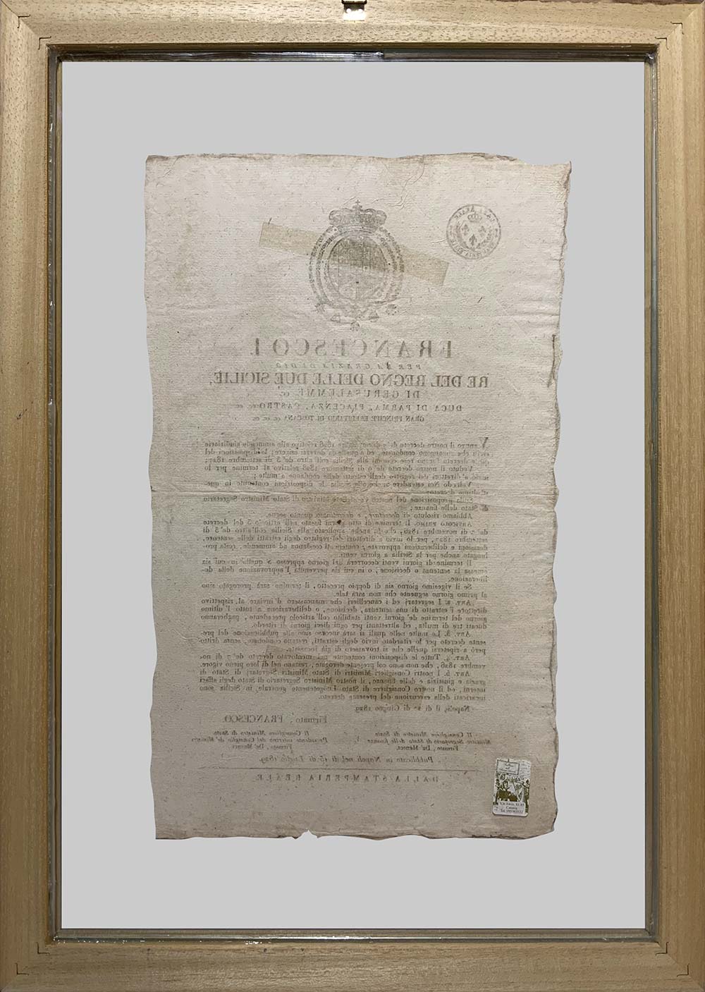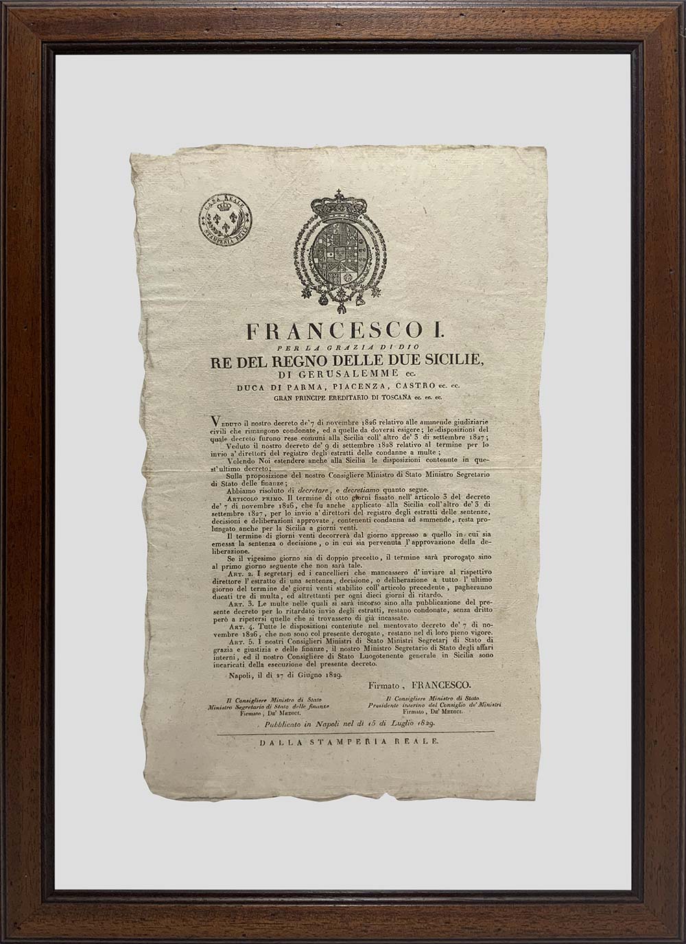 Decreto Reale 1829 di Francesco I, Re del Regno delle due Sicilie. Cm 40x25. In cornice
