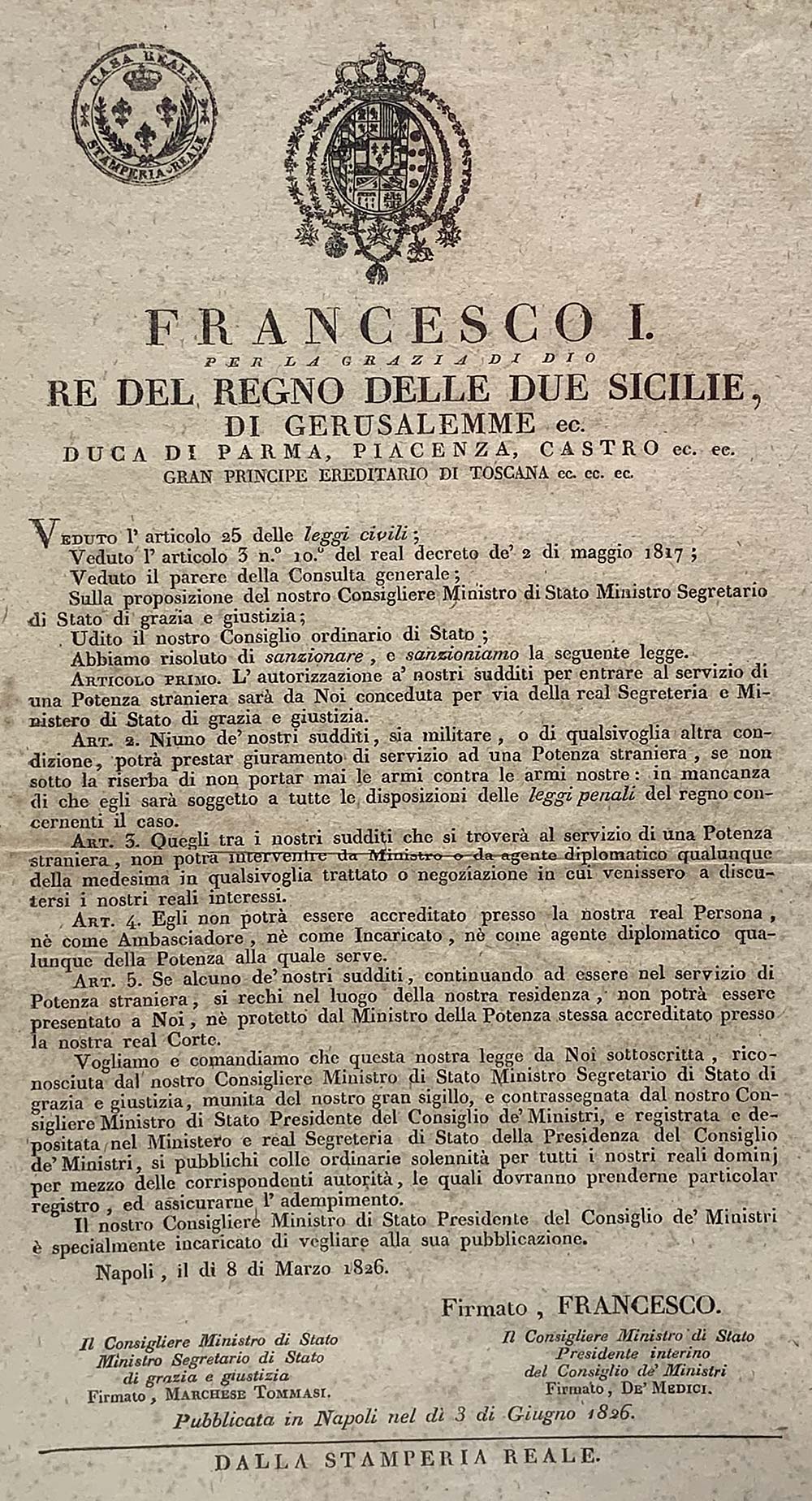 Decreto Reale 1826 di Francesco I, Re del Regno delle due Sicilie. Cm 40x25,...