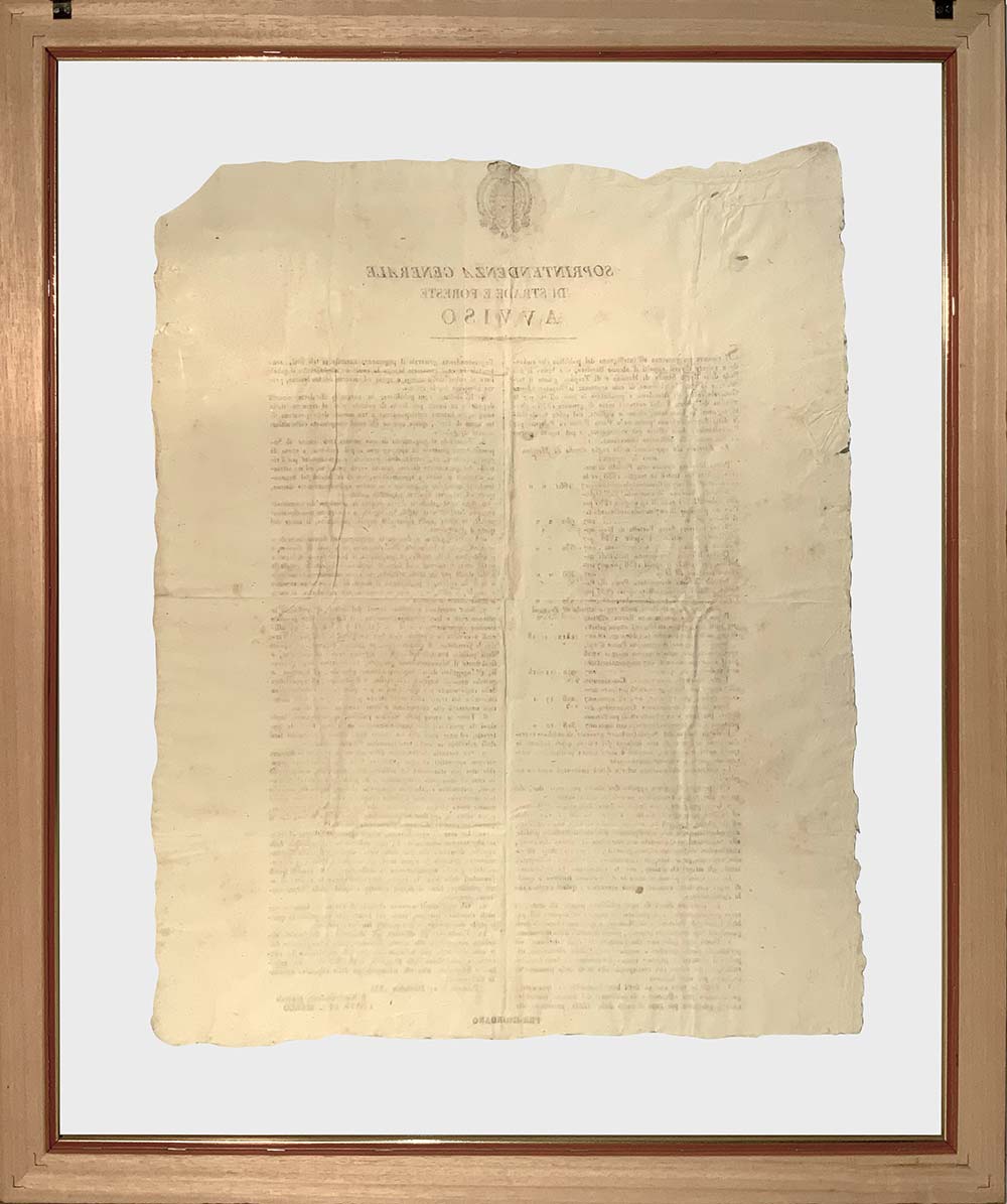 Decreto della Sovrintendenza Generale di strade e foreste. Avviso. Palermo, 21 Dicembre 1835. Cm 49x41, In cornice.
