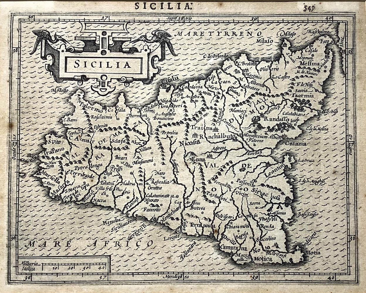 Piccola carta della Sicilia, 1610, Hondius-Mercator. Cm 13,5x18, incisione in...