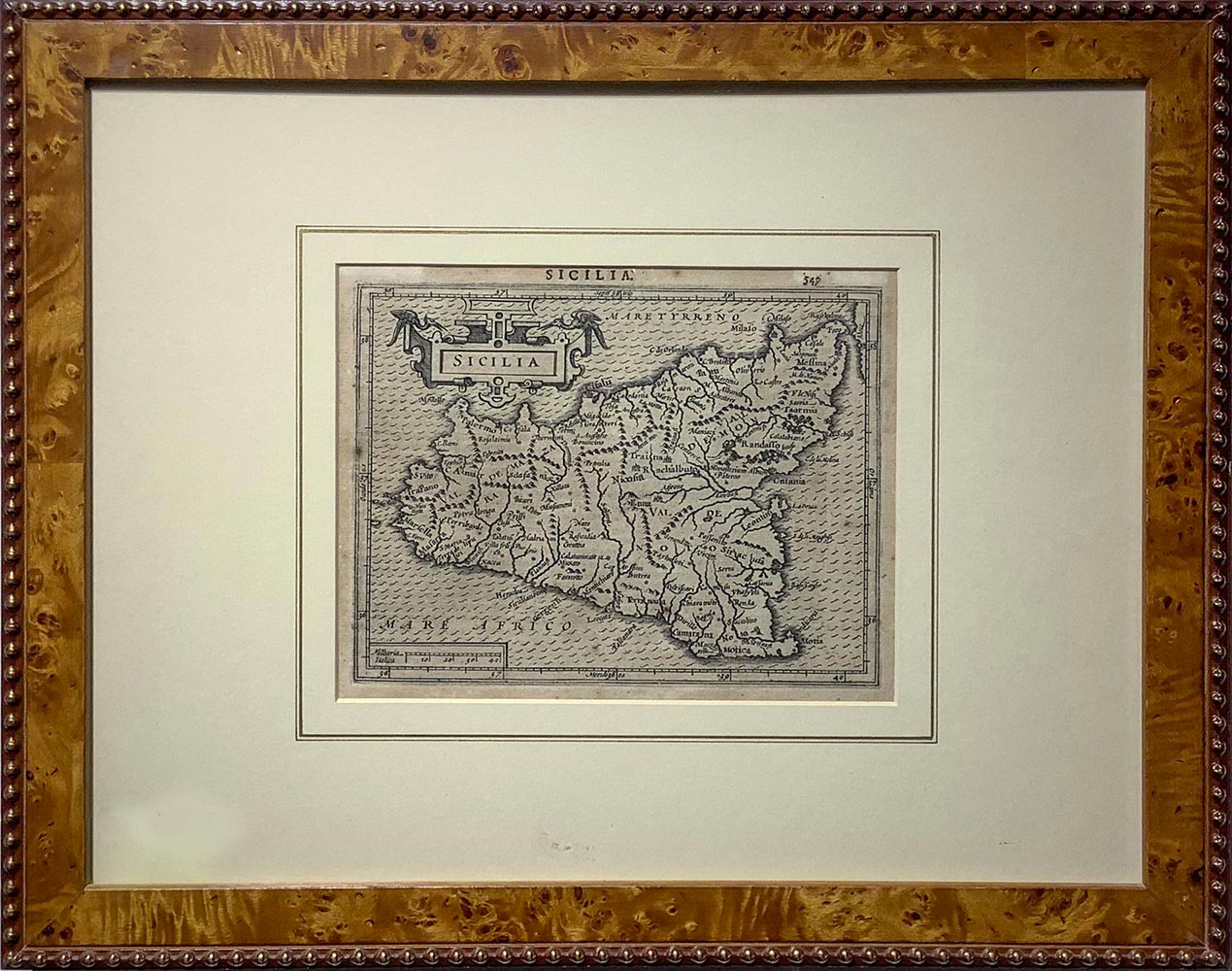 Piccola carta della Sicilia, 1610, Hondius-Mercator. Cm 13,5x18, incisione in rame. Con cornice in radica e bordo dorato cm 35x43. Ottime condizioni.