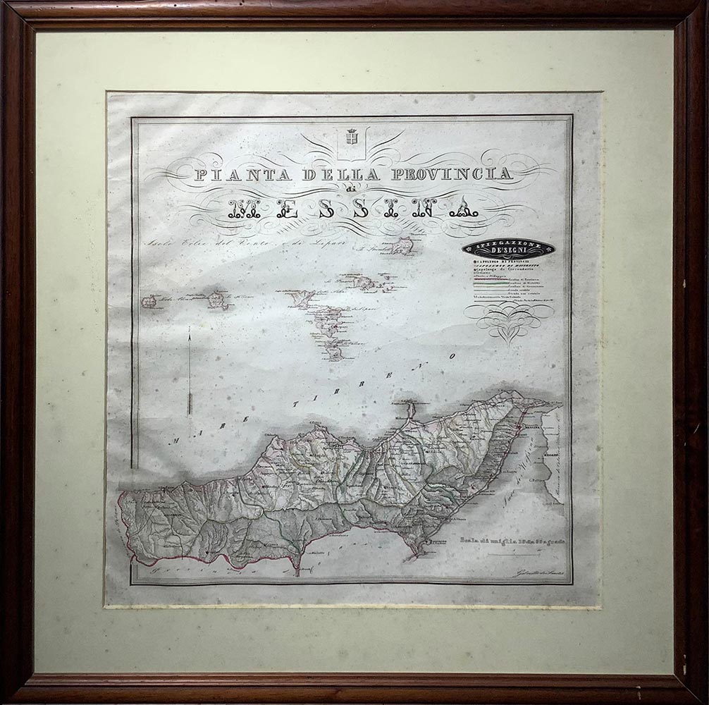 "Pianta della provincia di Messina, 1844, divisione amministrativa del regno delle due Sicilie tratta da ""Atlante cartografico del regno delle due Sicilie"", Napoli. Intere ristampe 1840-1856. 46 x 40, incisione in rame. Cm 64 x 59, con cornice coeva color noce. Bella opera grafica e calligrafica. Ottime condizioni."