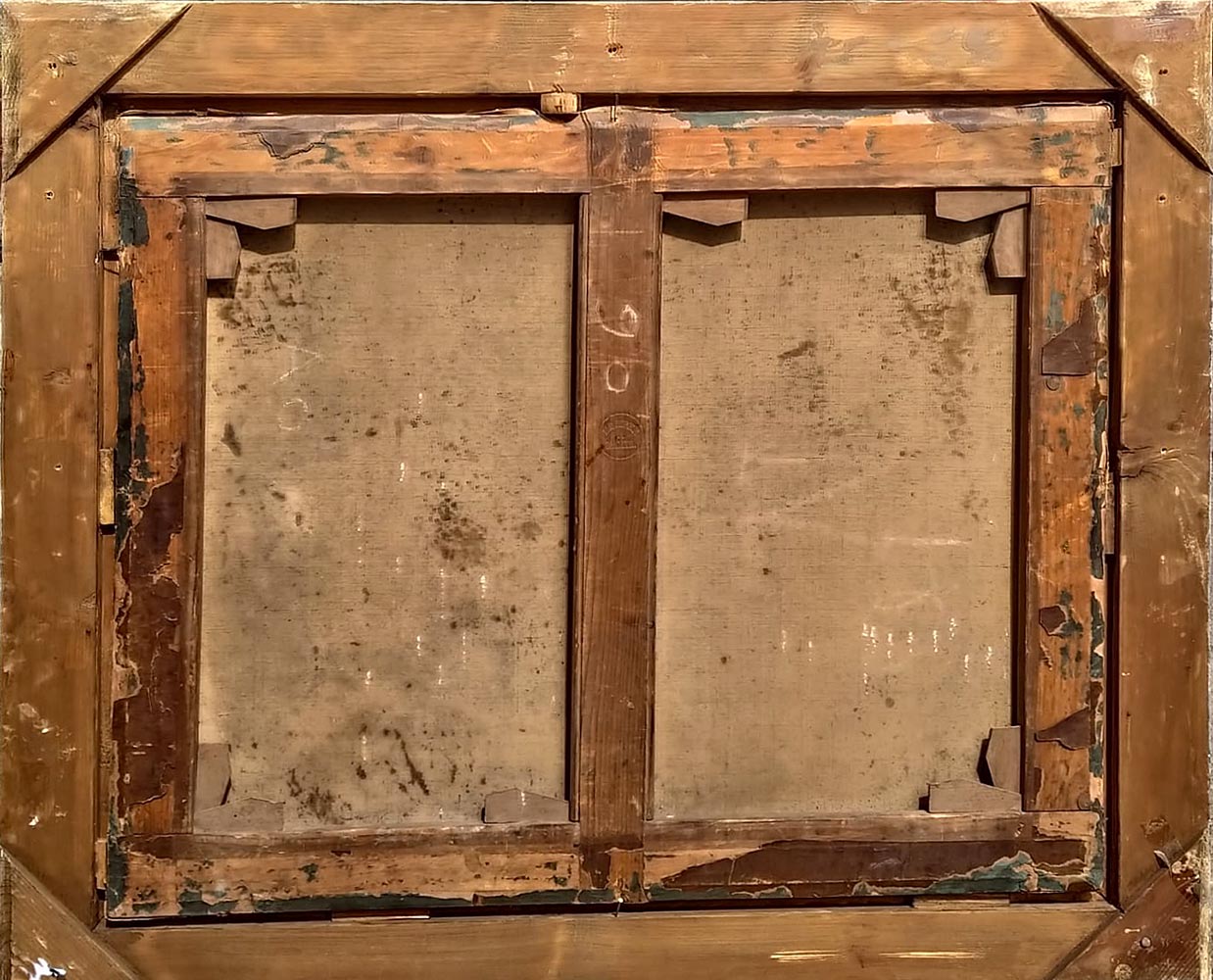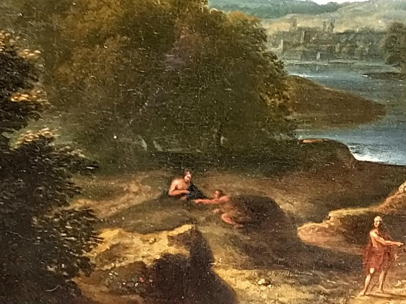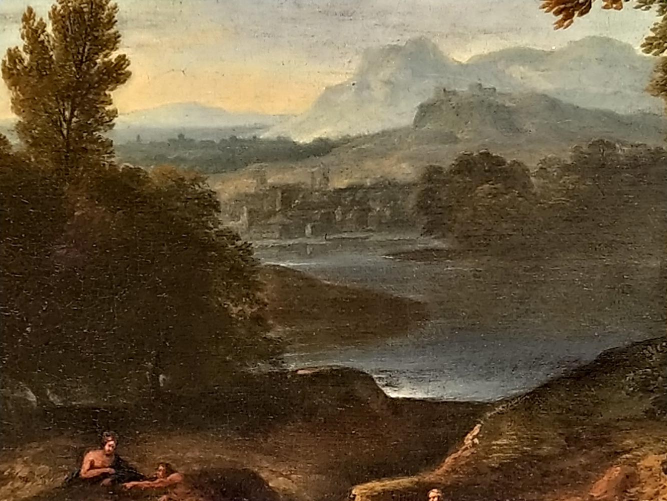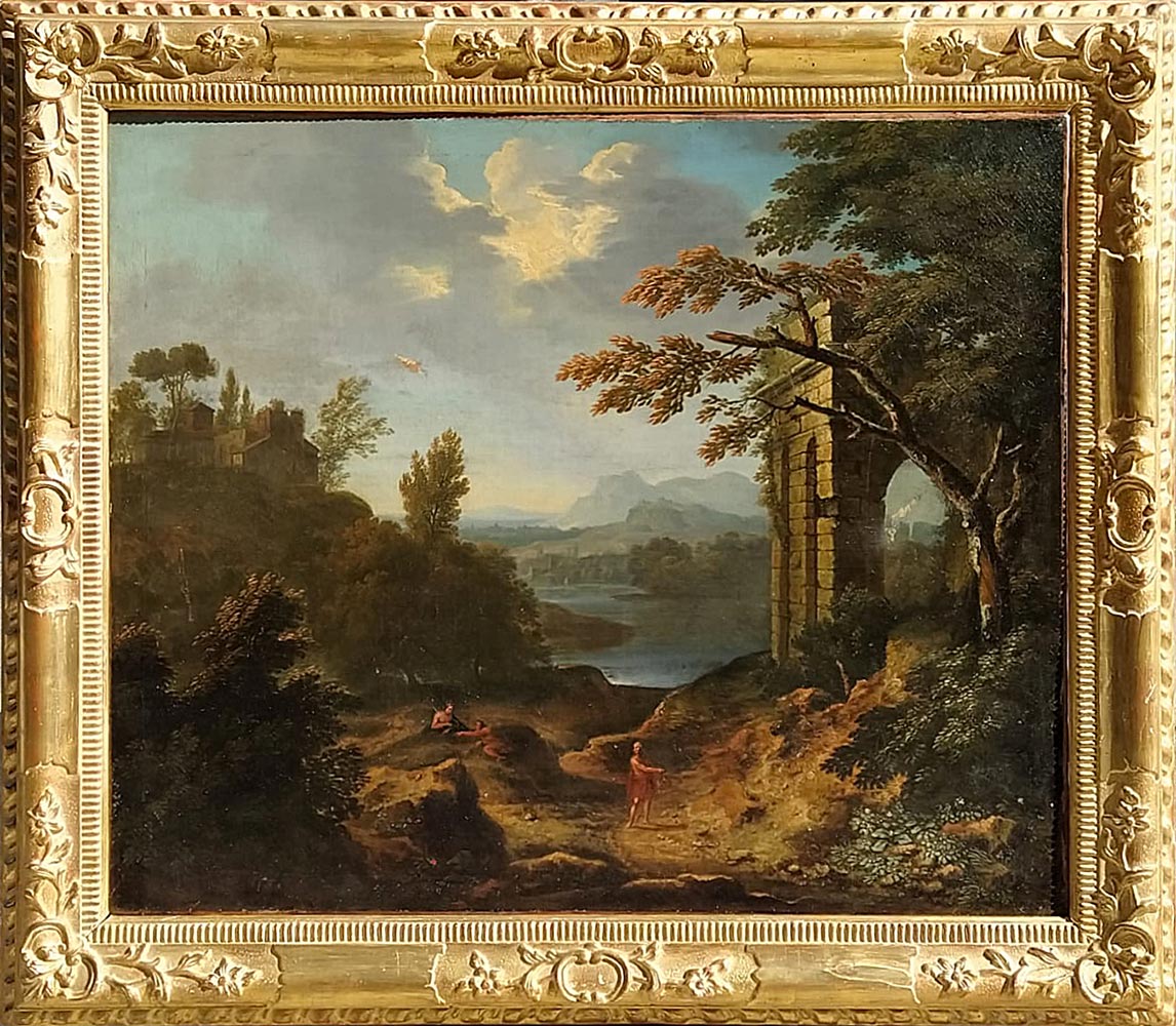 Jan Franz van Bloomen (Anversa 1662-Roma 1740) detto "l'Orizzonte". Attrib. Paesaggio con personaggi. 60x75, olio su tela. "Pittore di origine fiamminga, dopo essere stato a Parigi e Lione, si recò a Roma, insieme al fratello Pieter, dove la sua presenza è documentata sin dal 1686. Le sue opere sono lo specchio e del tempo che visse. Infatti esse sono il riflesso di quella società arcadica che anelava a un'esistenza che vede l'arte quale fonte di serena tranquillità e di ispirazione classica in reazione agli eccessi formalistici del barocco. La sua espressione pittorica trae fonte è origine da una radice prettamente fiamminga , essa si caratterizza con una estrema riservatezza e precisione da cui emergono ordine , chiarezza e eleganza formale. In poche parole, un realismo analitico che il suo pennello concretizza raffigurando vedute di paesaggi romani e laziali. I motivi pittorici lo fanno apparire simile a Gaspard Dughet (Roma 1615-1675), rivelando un temperamento romantico sottoposto a una disciplina classica nelle luci, nelle ombre, nello scenografie panoramiche che gli valsero il soprannome “Orizzonte”. Fu tra i paesisti fu tra i più apprezzati ."STUDIO ASOR