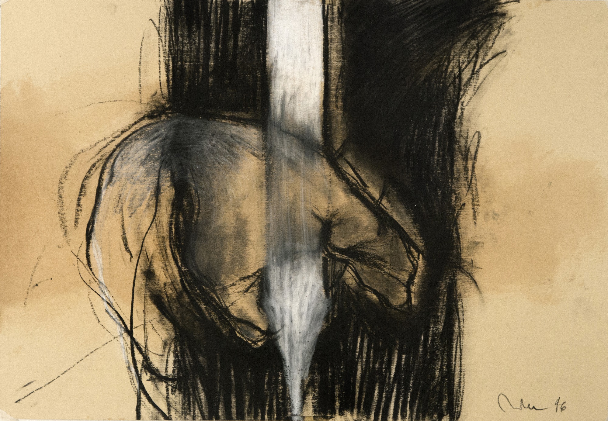 carboncino e pastelli ad olio su cartoncino cm 32,5x46,5 del 1996. Opera firmata e datata “96”in basso a destra. Autentica su fotografia a cura dell’artista.